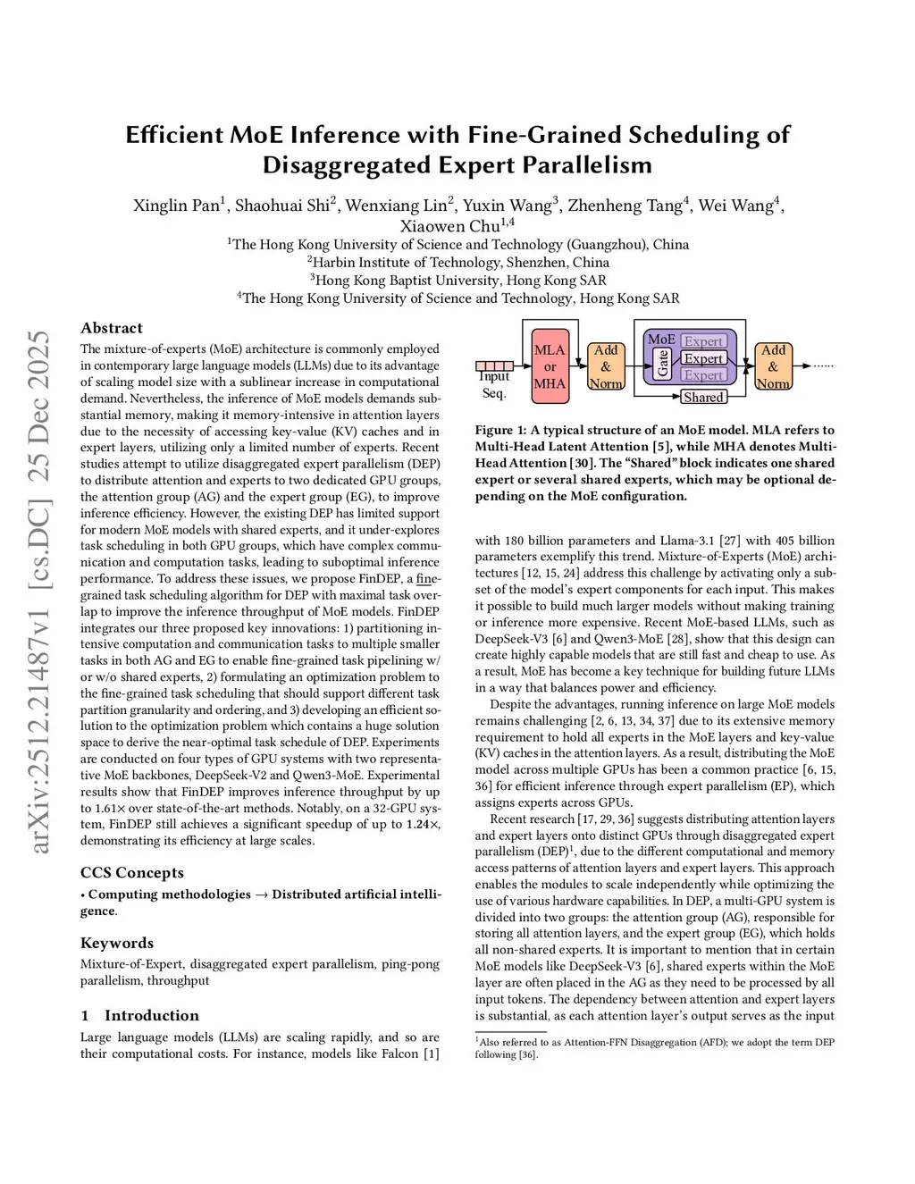 The mixture-of-experts (MoE) architecture scales model size with sublinear computational increase but suffers from memory-intensive inference due to KV caches and sparse expert activation. Recent disaggregated expert parallelism (DEP) distributes attention and experts to dedicated GPU groups but lacks support for shared experts and efficient task scheduling, limiting performance.We propose FinDEP, a fine-grained task scheduling algorithm for DEP that maximizes task overlap to improve MoE inference throughput. FinDEP introduces three innovations: 1) partitioning computation/communication into smaller tasks for fine-grained pipelining, 2) formulating a scheduling optimization supporting variable granularity and ordering, and 3) developing an efficient solver for this large search space.Experiments on four GPU systems with DeepSeek-V2 and Qwen3-MoE show FinDEP improves throughput by up to 1.61x over prior methods, achieving up to 1.24x speedup on a 32-GPU system.
