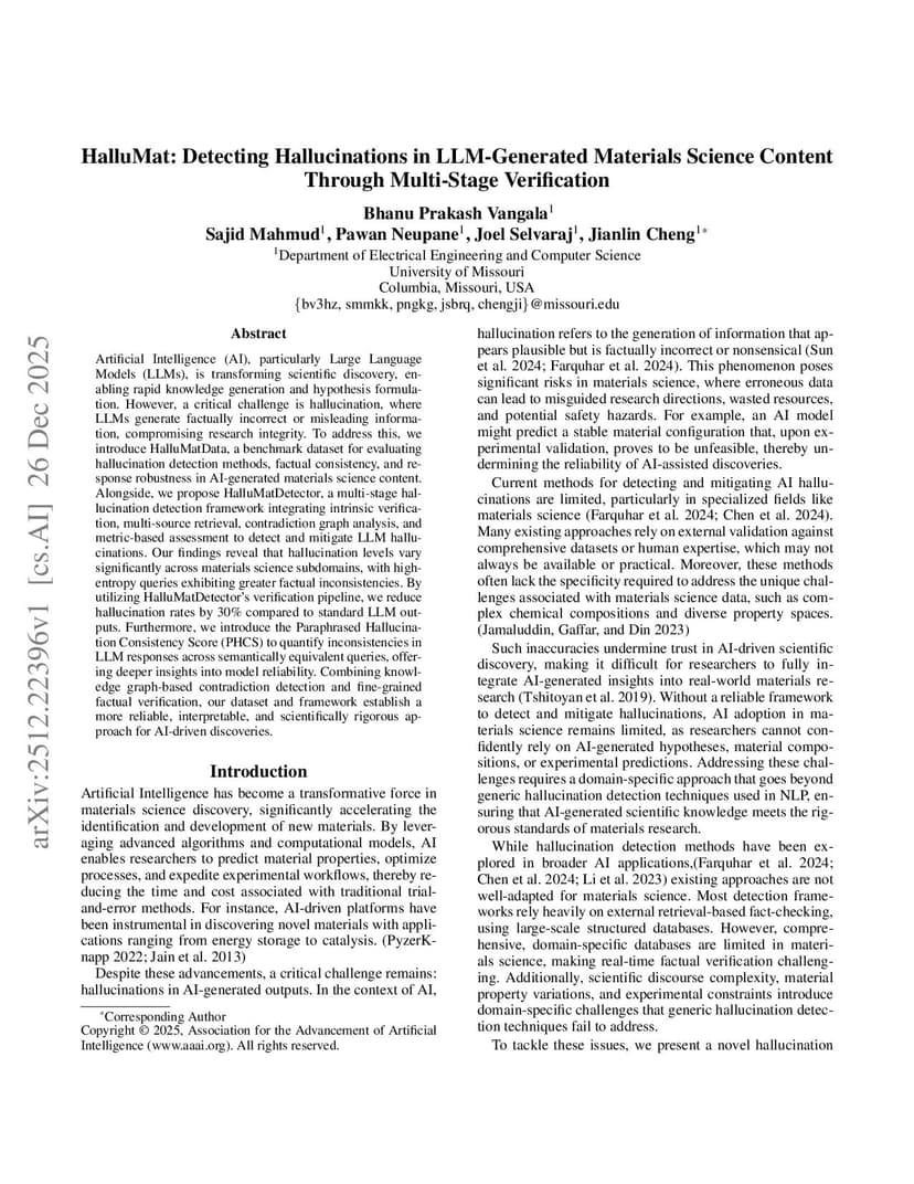 Artificial Intelligence (AI), particularly Large Language Models (LLMs), is transforming scientific discovery, enabling rapid knowledge generation and hypothesis formulation. However, a critical challenge is hallucination, where LLMs generate factually incorrect or misleading information, compromising research integrity. To address this, we introduce HalluMatData, a benchmark dataset for evaluating hallucination detection methods, factual consistency, and response robustness in AI-generated materials science content. Alongside this, we propose HalluMatDetector, a multi-stage hallucination detection framework that integrates intrinsic verification, multi-source retrieval, contradiction graph analysis, and metric-based assessment to detect and mitigate LLM hallucinations. Our findings reveal that hallucination levels vary significantly across materials science subdomains, with high-entropy queries exhibiting greater factual inconsistencies. By utilizing HalluMatDetector verification pipeline, we reduce hallucination rates by 30% compared to standard LLM outputs. Furthermore, we introduce the Paraphrased Hallucination Consistency Score (PHCS) to quantify inconsistencies in LLM responses across semantically equivalent queries, offering deeper insights into model reliability.