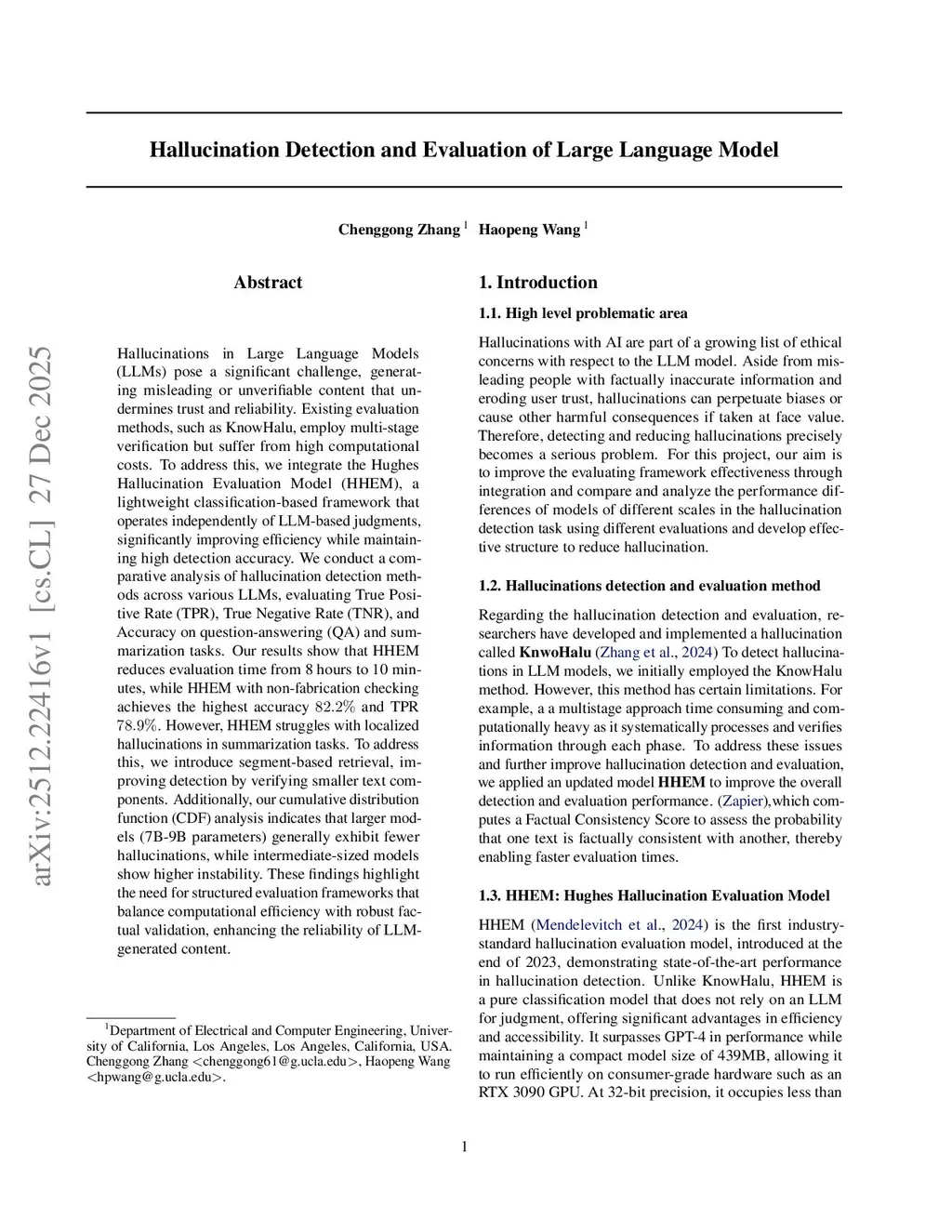 Hallucinations in Large Language Models (LLMs) pose a significant challenge, generating misleading or unverifiable content that undermines trust and reliability. Existing evaluation methods, such as KnowHalu, employ multi-stage verification but suffer from high computational costs. To address this, we integrate the Hughes Hallucination Evaluation Model (HHEM), a lightweight classification-based framework that operates independently of LLM-based judgments, significantly improving efficiency while maintaining high detection accuracy. We conduct a comparative analysis of hallucination detection methods across various LLMs, evaluating True Positive Rate (TPR), True Negative Rate (TNR), and Accuracy on question-answering (QA) and summarization tasks. Our results show that HHEM reduces evaluation time from 8 hours to 10 minutes, while HHEM with non-fabrication checking achieves the highest accuracy \(82.2\%\) and TPR \(78.9\%\). However, HHEM struggles with localized hallucinations in summarization tasks. To address this, we introduce segment-based retrieval, improving detection by verifying smaller text components. Additionally, our cumulative distribution function (CDF) analysis indicates that larger models (7B-9B parameters) generally exhibit fewer hallucinations, while intermediate-sized models show higher instability. These findings highlight the need for structured evaluation frameworks that balance computational efficiency with robust factual validation, enhancing the reliability of LLM-generated content.