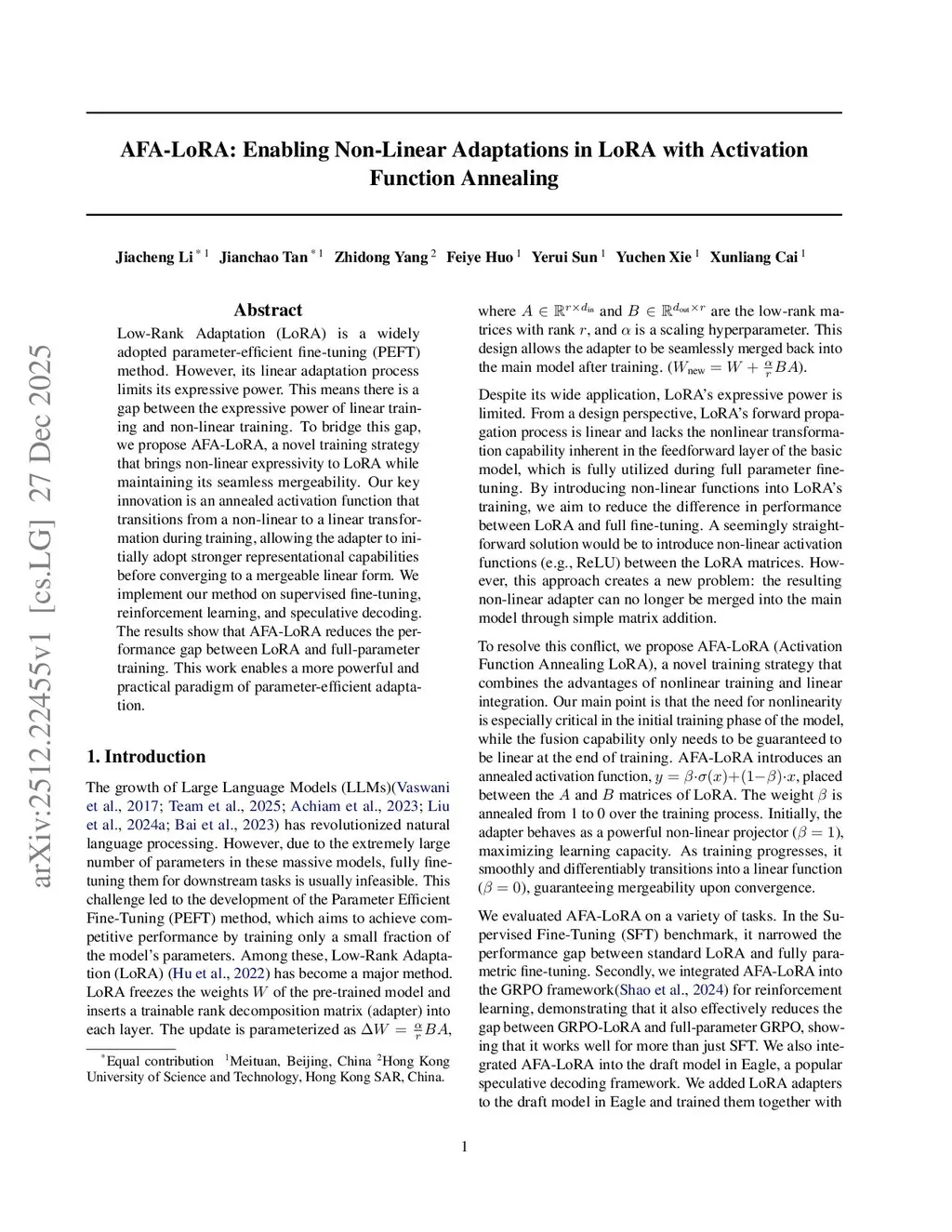 Low-Rank Adaptation (LoRA) is a widely adopted parameter-efficient fine-tuning (PEFT) method. However, its linear adaptation process limits its expressive power. This means there is a gap between the expressive power of linear training and non-linear training. To bridge this gap, we propose AFA-LoRA, a novel training strategy that brings non-linear expressivity to LoRA while maintaining its seamless mergeability. Our key innovation is an annealed activation function that transitions from a non-linear to a linear transformation during training, allowing the adapter to initially adopt stronger representational capabilities before converging to a mergeable linear form. We implement our method on supervised fine-tuning, reinforcement learning, and speculative decoding. The results show that AFA-LoRA reduces the performance gap between LoRA and full-parameter training. This work enables a more powerful and practical paradigm of parameter-efficient adaptation.