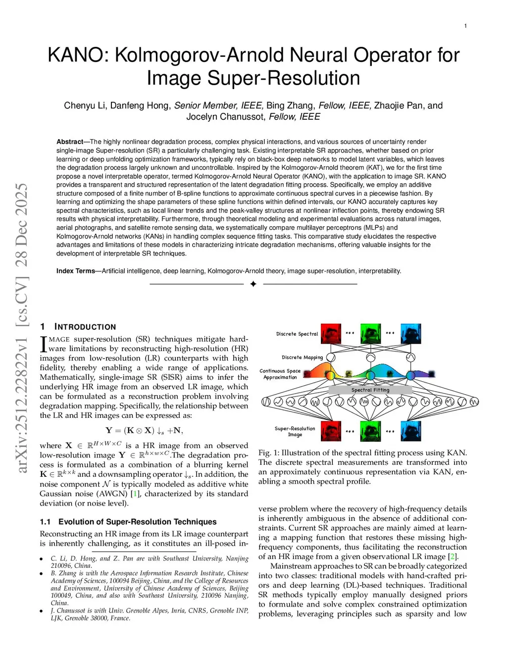 The highly nonlinear degradation process, complex physical interactions, and various sources of uncertainty render single-image Super-resolution (SR) a particularly challenging task. Existing interpretable SR approaches, whether based on prior learning or deep unfolding optimization frameworks, typically rely on black-box deep networks to model latent variables, which leaves the degradation process largely unknown and uncontrollable. Inspired by the Kolmogorov-Arnold theorem (KAT), we for the first time propose a novel interpretable operator, termed Kolmogorov-Arnold Neural Operator (KANO), with the application to image SR. KANO provides a transparent and structured representation of the latent degradation fitting process. Specifically, we employ an additive structure composed of a finite number of B-spline functions to approximate continuous spectral curves in a piecewise fashion. By learning and optimizing the shape parameters of these spline functions within defined intervals, our KANO accurately captures key spectral characteristics, such as local linear trends and the peak-valley structures at nonlinear inflection points, thereby endowing SR results with physical interpretability. Furthermore, through theoretical modeling and experimental evaluations across natural images, aerial photographs, and satellite remote sensing data, we systematically compare multilayer perceptrons (MLPs) and Kolmogorov-Arnold networks (KANs) in handling complex sequence fitting tasks. This comparative study elucidates the respective advantages and limitations of these models in characterizing intricate degradation mechanisms, offering valuable insights for the development of interpretable SR techniques.