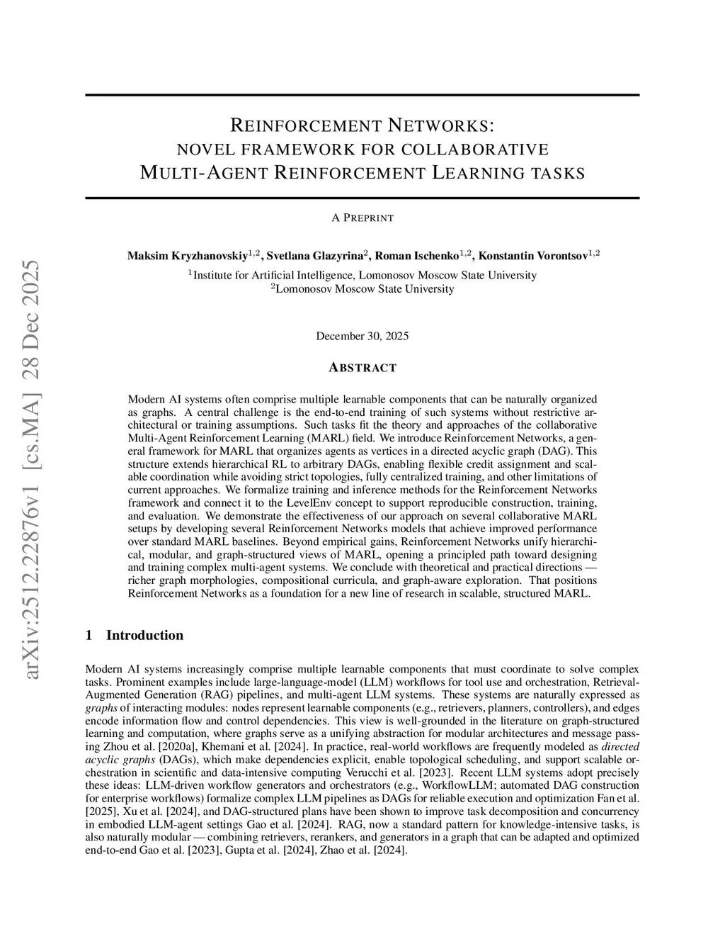 Modern AI systems often comprise multiple learnable components that can be naturally organized as graphs. A central challenge is the end-to-end training of such systems without restrictive architectural or training assumptions. Such tasks fit the theory and approaches of the collaborative Multi-Agent Reinforcement Learning (MARL) field. We introduce Reinforcement Networks, a general framework for MARL that organizes agents as vertices in a directed acyclic graph (DAG). This structure extends hierarchical RL to arbitrary DAGs, enabling flexible credit assignment and scalable coordination while avoiding strict topologies, fully centralized training, and other limitations of current approaches. We formalize training and inference methods for the Reinforcement Networks framework and connect it to the LevelEnv concept to support reproducible construction, training, and evaluation. We demonstrate the effectiveness of our approach on several collaborative MARL setups by developing several Reinforcement Networks models that achieve improved performance over standard MARL baselines. Beyond empirical gains, Reinforcement Networks unify hierarchical, modular, and graph-structured views of MARL, opening a principled path toward designing and training complex multi-agent systems. We conclude with theoretical and practical directions - richer graph morphologies, compositional curricula, and graph-aware exploration. That positions Reinforcement Networks as a foundation for a new line of research in scalable, structured MARL.