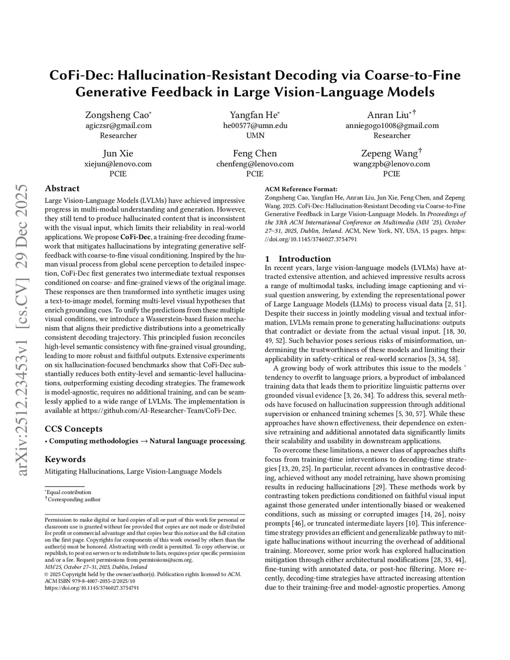 Large Vision-Language Models (LVLMs) have achieved impressive progress in multi-modal understanding and generation. However, they still tend to produce hallucinated content that is inconsistent with the visual input, which limits their reliability in real-world applications. We propose \textbf{CoFi-Dec}, a training-free decoding framework that mitigates hallucinations by integrating generative self-feedback with coarse-to-fine visual conditioning. Inspired by the human visual process from global scene perception to detailed inspection, CoFi-Dec first generates two intermediate textual responses conditioned on coarse- and fine-grained views of the original image. These responses are then transformed into synthetic images using a text-to-image model, forming multi-level visual hypotheses that enrich grounding cues. To unify the predictions from these multiple visual conditions, we introduce a Wasserstein-based fusion mechanism that aligns their predictive distributions into a geometrically consistent decoding trajectory. This principled fusion reconciles high-level semantic consistency with fine-grained visual grounding, leading to more robust and faithful outputs. Extensive experiments on six hallucination-focused benchmarks show that CoFi-Dec substantially reduces both entity-level and semantic-level hallucinations, outperforming existing decoding strategies. The framework is model-agnostic, requires no additional training, and can be seamlessly applied to a wide range of LVLMs. The implementation is available atthis https URL.