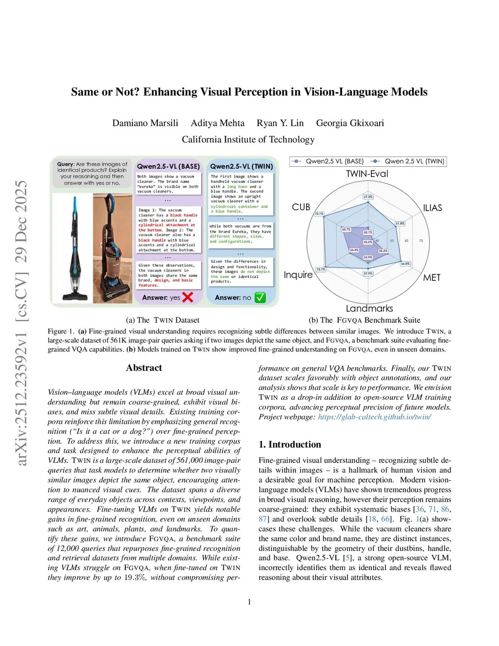 Vision-language models (VLMs) excel at broad visual understanding but remain coarse-grained, exhibit visual biases, and miss subtle visual details. Existing training corpora reinforce this limitation by emphasizing general recognition ("Is it a cat or a dog?") over fine-grained perception. To address this, we introduce a new training corpus and task designed to enhance the perceptual abilities of VLMs. TWIN is a large-scale dataset of 561,000 image-pair queries that task models to determine whether two visually similar images depict the same object, encouraging attention to nuanced visual cues. The dataset spans a diverse range of everyday objects across contexts, viewpoints, and appearances. Fine-tuning VLMs on TWIN yields notable gains in fine-grained recognition, even on unseen domains such as art, animals, plants, and landmarks. To quantify these gains, we introduce FGVQA, a benchmark suite of 12,000 queries that repurposes fine-grained recognition and retrieval datasets from multiple domains. While existing VLMs struggle on FGVQA, when fine-tuned on TWIN they improve by up to 19.3%, without compromising performance on general VQA benchmarks. Finally, our TWIN dataset scales favorably with object annotations, and our analysis shows that scale is key to performance. We envision TWIN as a drop-in addition to open-source VLM training corpora, advancing perceptual precision of future models. Project webpage:this https URL