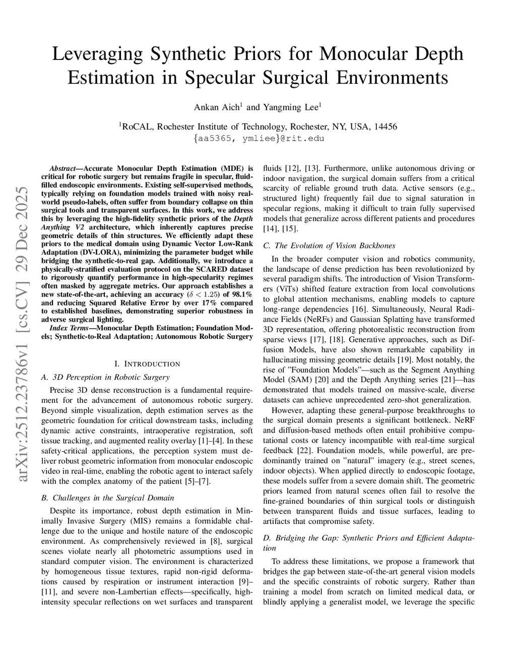 Accurate Monocular Depth Estimation (MDE) is critical for robotic surgery but remains fragile in specular, fluid-filled endoscopic environments. Existing self-supervised methods, typically relying on foundation models trained with noisy real-world pseudo-labels, often suffer from boundary collapse on thin surgical tools and transparent surfaces. In this work, we address this by leveraging the high-fidelity synthetic priors of the Depth Anything V2 architecture, which inherently captures precise geometric details of thin structures. We efficiently adapt these priors to the medical domain using Dynamic Vector Low-Rank Adaptation (DV-LORA), minimizing the parameter budget while bridging the synthetic-to-real gap. Additionally, we introduce a physically-stratified evaluation protocol on the SCARED dataset to rigorously quantify performance in high-specularity regimes often masked by aggregate metrics. Our approach establishes a new state-of-the-art, achieving an accuracy (< 1.25) of 98.1% and reducing Squared Relative Error by over 17% compared to established baselines, demonstrating superior robustness in adverse surgical lighting.
