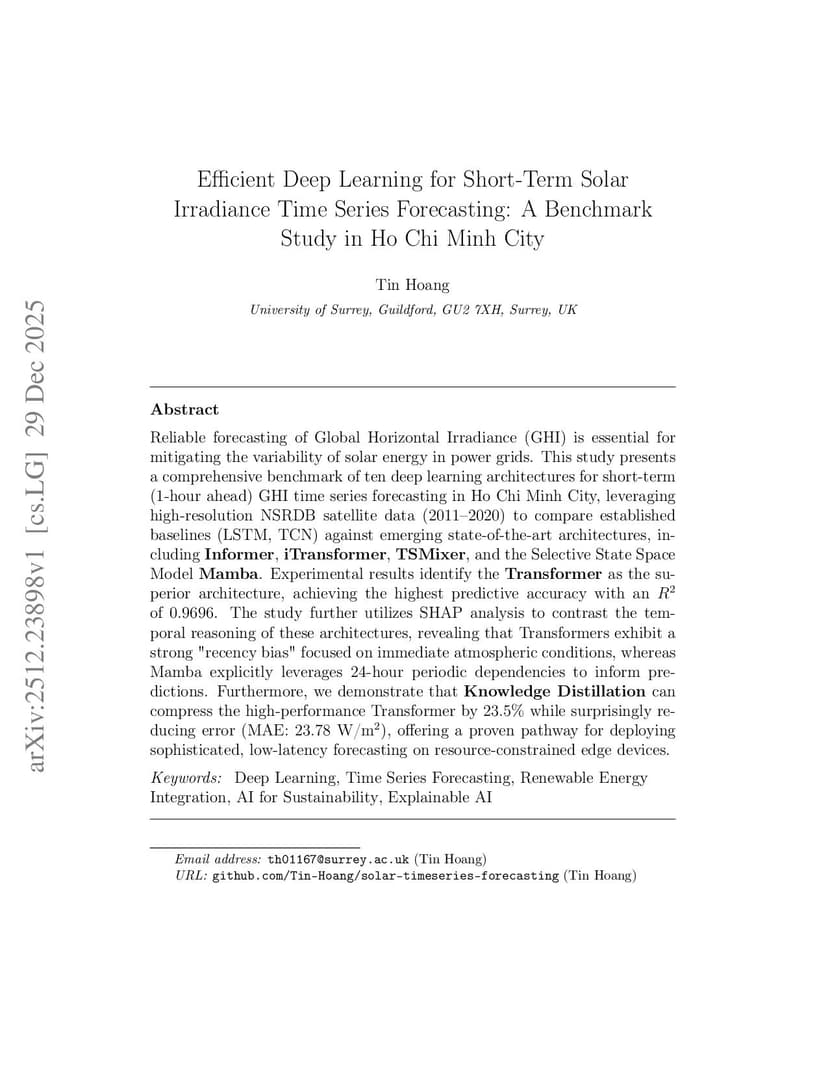 Reliable forecasting of Global Horizontal Irradiance (GHI) is essential for mitigating the variability of solar energy in power grids. This study presents a comprehensive benchmark of ten deep learning architectures for short-term (1-hour ahead) GHI time series forecasting in Ho Chi Minh City, leveraging high-resolution NSRDB satellite data (2011-2020) to compare established baselines (e.g. LSTM, TCN) against emerging state-of-the-art architectures, including Transformer, Informer, iTransformer, TSMixer, and Mamba. Experimental results identify the Transformer as the superior architecture, achieving the highest predictive accuracy with an R^2 of 0.9696. The study further utilizes SHAP analysis to contrast the temporal reasoning of these architectures, revealing that Transformers exhibit a strong "recency bias" focused on immediate atmospheric conditions, whereas Mamba explicitly leverages 24-hour periodic dependencies to inform predictions. Furthermore, we demonstrate that Knowledge Distillation can compress the high-performance Transformer by 23.5% while surprisingly reducing error (MAE: 23.78 W/m^2), offering a proven pathway for deploying sophisticated, low-latency forecasting on resource-constrained edge devices.