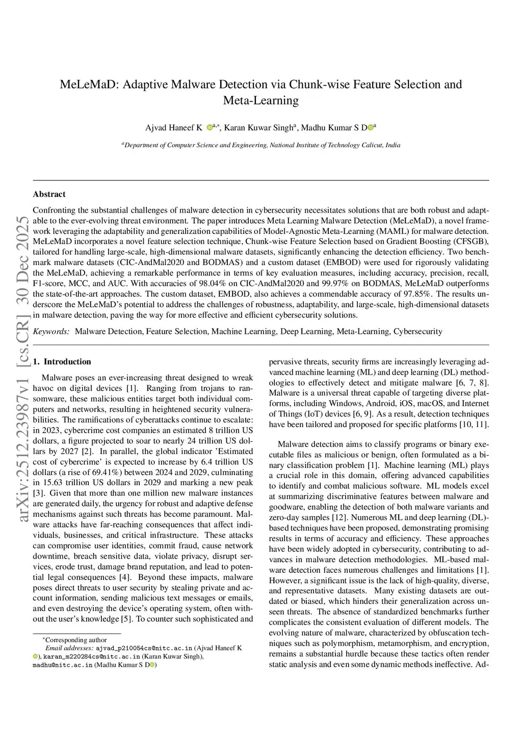 MeLeMaD: Adaptive Malware Detection via Chunk-wise Feature Selection and Meta-Learning