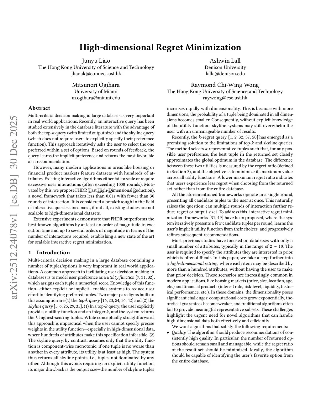 Multi-criteria decision making in large databases is very important in real world applications. Recently, an interactive query has been studied extensively in the database literature with the advantage of both the top-k query (with limited output size) and the skyline query (which does not require users to explicitly specify their preference function). This approach iteratively asks the user to select the one preferred within a set of options. Based on rounds of feedback, the query learns the implicit preference and returns the most favorable as a recommendation.However, many modern applications in areas like housing or financial product markets feature datasets with hundreds of attributes. Existing interactive algorithms either fail to scale or require excessive user interactions (often exceeding 1000 rounds). Motivated by this, we propose FHDR (Fast High-Dimensional Reduction), a novel framework that takes less than 0.01s with fewer than 30 rounds of interaction. It is considered a breakthrough in the field of interactive queries since most, if not all, existing studies are not scalable to high-dimensional datasets.Extensive experiments demonstrate that FHDR outperforms the best-known algorithms by at least an order of magnitude in execution time and up to several orders of magnitude in terms of the number of interactions required, establishing a new state of the art for scalable interactive regret minimization.