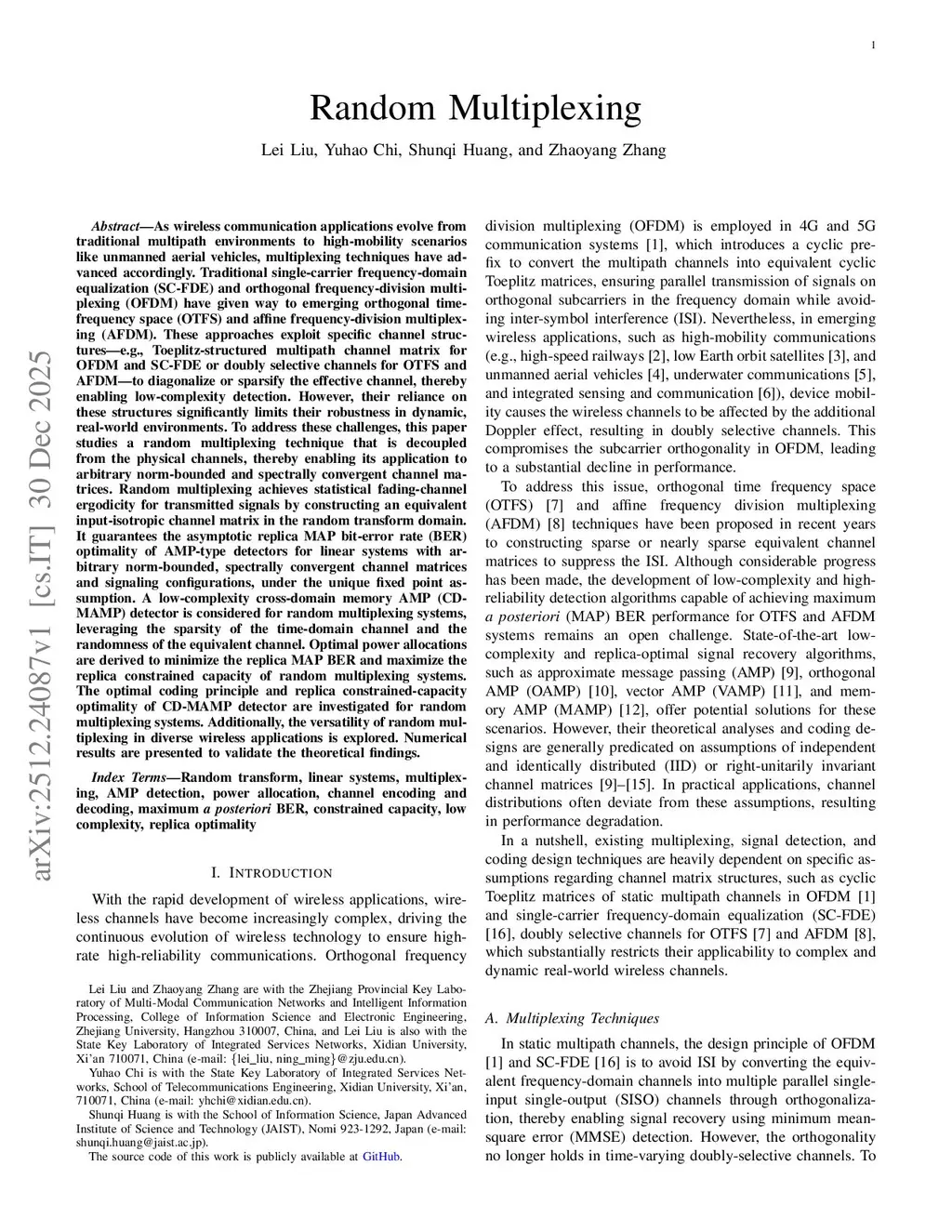As wireless communication applications evolve from traditional multipath environments to high-mobility scenarios like unmanned aerial vehicles, multiplexing techniques have advanced accordingly. Traditional single-carrier frequency-domain equalization (SC-FDE) and orthogonal frequency-division multiplexing (OFDM) have given way to emerging orthogonal time-frequency space (OTFS) and affine frequency-division multiplexing (AFDM). These approaches exploit specific channel structures to diagonalize or sparsify the effective channel, thereby enabling low-complexity detection. However, their reliance on these structures significantly limits their robustness in dynamic, real-world environments. To address these challenges, this paper studies a random multiplexing technique that is decoupled from the physical channels, enabling its application to arbitrary norm-bounded and spectrally convergent channel matrices. Random multiplexing achieves statistical fading-channel ergodicity for transmitted signals by constructing an equivalent input-isotropic channel matrix in the random transform domain. It guarantees the asymptotic replica MAP bit-error rate (BER) optimality of AMP-type detectors for linear systems with arbitrary norm-bounded, spectrally convergent channel matrices and signaling configurations, under the unique fixed point assumption. A low-complexity cross-domain memory AMP (CD-MAMP) detector is considered, leveraging the sparsity of the time-domain channel and the randomness of the equivalent channel. Optimal power allocations are derived to minimize the replica MAP BER and maximize the replica constrained capacity of random multiplexing systems. The optimal coding principle and replica constrained-capacity optimality of CD-MAMP detector are investigated for random multiplexing systems. Additionally, the versatility of random multiplexing in diverse wireless applications is explored.