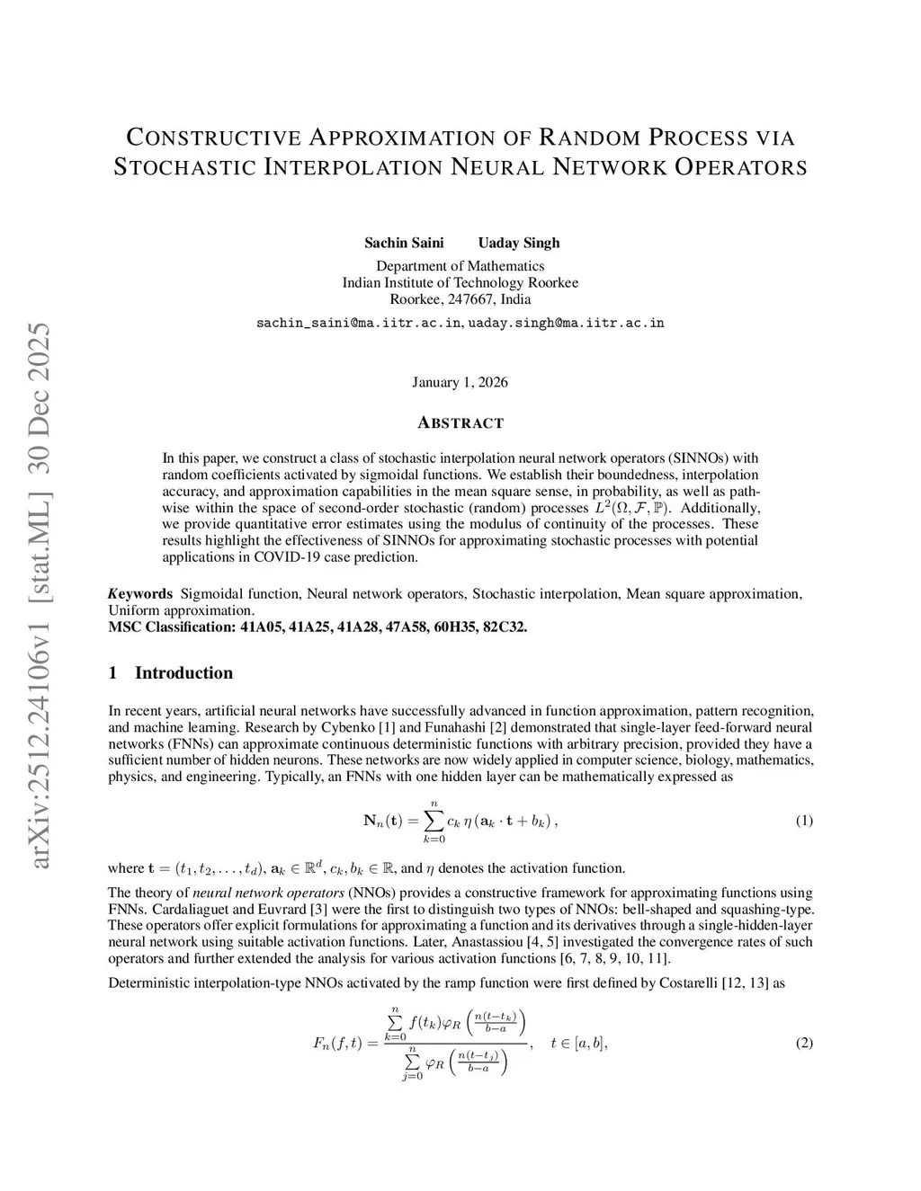 In this paper, we construct a class of stochastic interpolation neural network operators (SINNOs) with random coefficients activated by sigmoidal functions. We establish their boundedness, interpolation accuracy, and approximation capabilities in the mean square sense, in probability, as well as path-wise within the space of second-order stochastic (random) processes \( L^2(\Omega, \mathcal{F},\mathbb{P}) \). Additionally, we provide quantitative error estimates using the modulus of continuity of the processes. These results highlight the effectiveness of SINNOs for approximating stochastic processes with potential applications in COVID-19 case prediction.