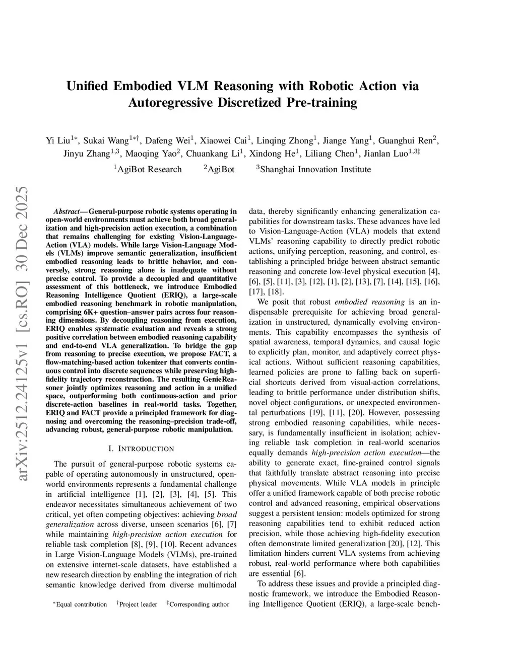 General-purpose robotic systems operating in open-world environments must achieve both broad generalization and high-precision action execution, a combination that remains challenging for existing Vision-Language-Action (VLA) models. While large Vision-Language Models (VLMs) improve semantic generalization, insufficient embodied reasoning leads to brittle behavior, and conversely, strong reasoning alone is inadequate without precise control. To provide a decoupled and quantitative assessment of this bottleneck, we introduce Embodied Reasoning Intelligence Quotient (ERIQ), a large-scale embodied reasoning benchmark in robotic manipulation, comprising 6K+ question-answer pairs across four reasoning dimensions. By decoupling reasoning from execution, ERIQ enables systematic evaluation and reveals a strong positive correlation between embodied reasoning capability and end-to-end VLA generalization. To bridge the gap from reasoning to precise execution, we propose FACT, a flow-matching-based action tokenizer that converts continuous control into discrete sequences while preserving high-fidelity trajectory reconstruction. The resulting GenieReasoner jointly optimizes reasoning and action in a unified space, outperforming both continuous-action and prior discrete-action baselines in real-world tasks. Together, ERIQ and FACT provide a principled framework for diagnosing and overcoming the reasoning-precision trade-off, advancing robust, general-purpose robotic manipulation. Project page:this https URL