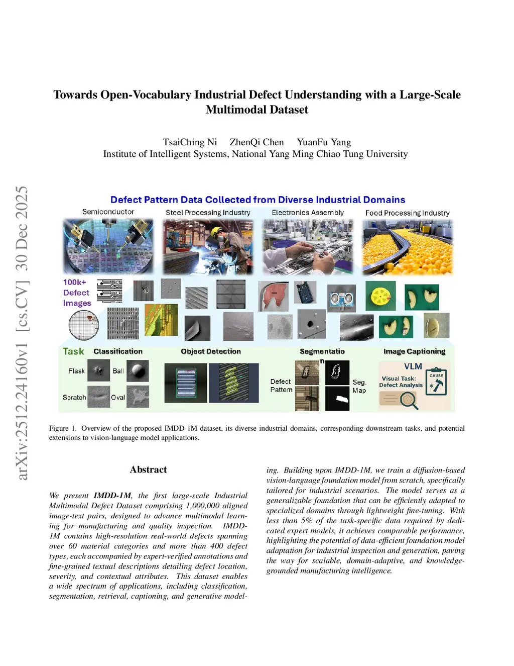 We present IMDD-1M, the first large-scale Industrial Multimodal Defect Dataset comprising 1,000,000 aligned image-text pairs, designed to advance multimodal learning for manufacturing and quality inspection. IMDD-1M contains high-resolution real-world defects spanning over 60 material categories and more than 400 defect types, each accompanied by expert-verified annotations and fine-grained textual descriptions detailing defect location, severity, and contextual attributes. This dataset enables a wide spectrum of applications, including classification, segmentation, retrieval, captioning, and generative modeling. Building upon IMDD-1M, we train a diffusion-based vision-language foundation model from scratch, specifically tailored for industrial scenarios. The model serves as a generalizable foundation that can be efficiently adapted to specialized domains through lightweight fine-tuning. With less than 5% of the task-specific data required by dedicated expert models, it achieves comparable performance, highlighting the potential of data-efficient foundation model adaptation for industrial inspection and generation, paving the way for scalable, domain-adaptive, and knowledge-grounded manufacturing intelligence. Additional details and resources can be found in this URL:this https URL