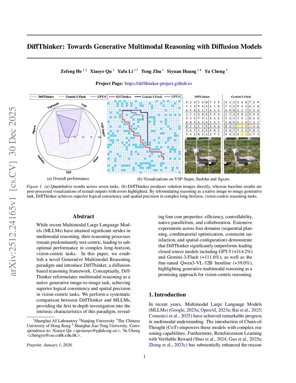 While recent Multimodal Large Language Models (MLLMs) have attained significant strides in multimodal reasoning, their reasoning processes remain predominantly text-centric, leading to suboptimal performance in complex long-horizon, vision-centric tasks. In this paper, we establish a novel Generative Multimodal Reasoning paradigm and introduce DiffThinker, a diffusion-based reasoning framework. Conceptually, DiffThinker reformulates multimodal reasoning as a native generative image-to-image task, achieving superior logical consistency and spatial precision in vision-centric tasks. We perform a systematic comparison between DiffThinker and MLLMs, providing the first in-depth investigation into the intrinsic characteristics of this paradigm, revealing four core properties: efficiency, controllability, native parallelism, and collaboration. Extensive experiments across four domains (sequential planning, combinatorial optimization, constraint satisfaction, and spatial configuration) demonstrate that DiffThinker significantly outperforms leading closed source models including GPT-5 (+314.2\%) and Gemini-3-Flash (+111.6\%), as well as the fine-tuned Qwen3-VL-32B baseline (+39.0\%), highlighting generative multimodal reasoning as a promising approach for vision-centric reasoning.