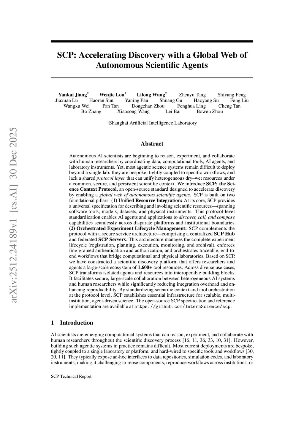 We introduce SCP: the Science Context Protocol, an open-source standard designed to accelerate discovery by enabling a global network of autonomous scientific agents. SCP is built on two foundational pillars: (1) Unified Resource Integration: At its core, SCP provides a universal specification for describing and invoking scientific resources, spanning software tools, models, datasets, and physical instruments. This protocol-level standardization enables AI agents and applications to discover, call, and compose capabilities seamlessly across disparate platforms and institutional boundaries. (2) Orchestrated Experiment Lifecycle Management: SCP complements the protocol with a secure service architecture, which comprises a centralized SCP Hub and federated SCP Servers. This architecture manages the complete experiment lifecycle (registration, planning, execution, monitoring, and archival), enforces fine-grained authentication and authorization, and orchestrates traceable, end-to-end workflows that bridge computational and physical laboratories. Based on SCP, we have constructed a scientific discovery platform that offers researchers and agents a large-scale ecosystem of more than 1,600 tool resources. Across diverse use cases, SCP facilitates secure, large-scale collaboration between heterogeneous AI systems and human researchers while significantly reducing integration overhead and enhancing reproducibility. By standardizing scientific context and tool orchestration at the protocol level, SCP establishes essential infrastructure for scalable, multi-institution, agent-driven science.
