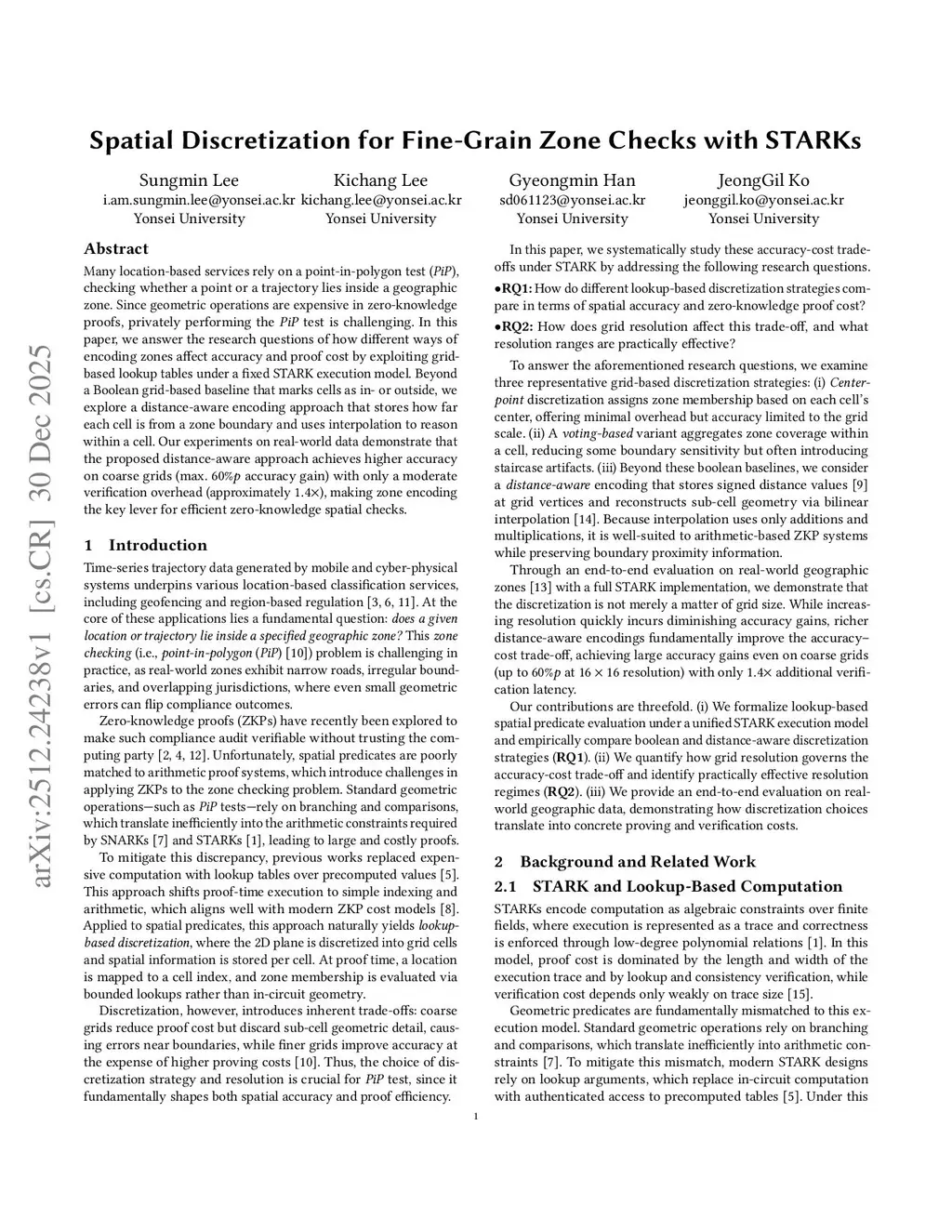Many location-based services rely on a point-in-polygon test (PiP), checking whether a point or a trajectory lies inside a geographic zone. Since geometric operations are expensive in zero-knowledge proofs, privately performing the PiP test is challenging. In this paper, we answer the research questions of how different ways of encoding zones affect accuracy and proof cost by exploiting gridbased lookup tables under a fixed STARK execution model. Beyond a Boolean grid-based baseline that marks cells as in- or outside, we explore a distance-aware encoding approach that stores how far each cell is from a zone boundary and uses interpolation to reason within a cell. Our experiments on real-world data demonstrate that the proposed distance-aware approach achieves higher accuracy on coarse grids (max. 60%p accuracy gain) with only a moderate verification overhead (approximately 1.4x), making zone encoding the key lever for efficient zero-knowledge spatial checks.