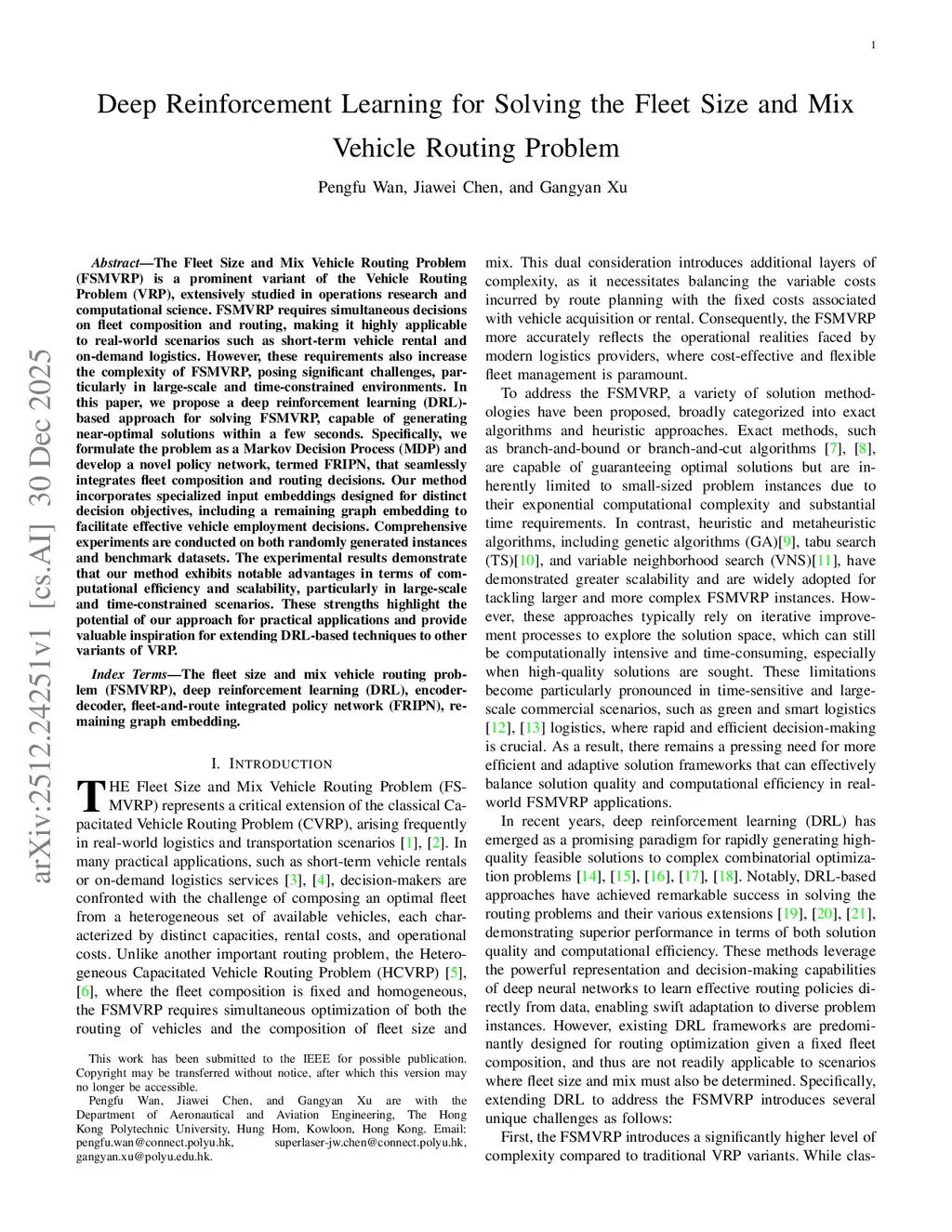 The Fleet Size and Mix Vehicle Routing Problem (FSMVRP) is a prominent variant of the Vehicle Routing Problem (VRP), extensively studied in operations research and computational science. FSMVRP requires simultaneous decisions on fleet composition and routing, making it highly applicable to real-world scenarios such as short-term vehicle rental and on-demand logistics. However, these requirements also increase the complexity of FSMVRP, posing significant challenges, particularly in large-scale and time-constrained environments. In this paper, we propose a deep reinforcement learning (DRL)-based approach for solving FSMVRP, capable of generating near-optimal solutions within a few seconds. Specifically, we formulate the problem as a Markov Decision Process (MDP) and develop a novel policy network, termed FRIPN, that seamlessly integrates fleet composition and routing decisions. Our method incorporates specialized input embeddings designed for distinctdecision objectives, including a remaining graph embedding to facilitate effective vehicle employment decisions. Comprehensive experiments are conducted on both randomly generated instances and benchmark datasets. The experimental results demonstrate that our method exhibits notable advantages in terms of computational efficiency and scalability, particularly in large-scale and time-constrained scenarios. These strengths highlight the potential of our approach for practical applications and provide valuable inspiration for extending DRL-based techniques to other variants of VRP.