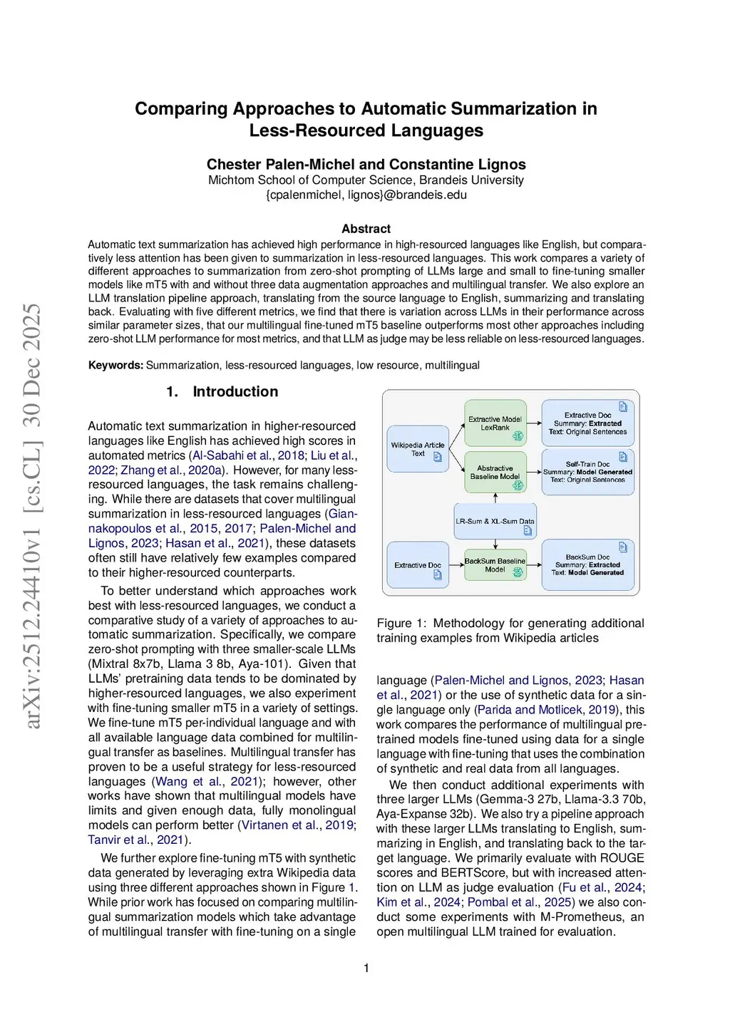 Automatic text summarization has achieved high performance in high-resourced languages like English, but comparatively less attention has been given to summarization in less-resourced languages. This work compares a variety of different approaches to summarization from zero-shot prompting of LLMs large and small to fine-tuning smaller models like mT5 with and without three data augmentation approaches and multilingual transfer. We also explore an LLM translation pipeline approach, translating from the source language to English, summarizing and translating back. Evaluating with five different metrics, we find that there is variation across LLMs in their performance across similar parameter sizes, that our multilingual fine-tuned mT5 baseline outperforms most other approaches including zero-shot LLM performance for most metrics, and that LLM as judge may be less reliable on less-resourced languages.