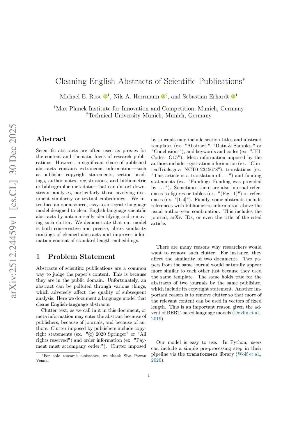 Scientific abstracts are often used as proxies for the content and thematic focus of research publications. However, a significant share of published abstracts contains extraneous information-such as publisher copyright statements, section headings, author notes, registrations, and bibliometric or bibliographic metadata-that can distort downstream analyses, particularly those involving document similarity or textual embeddings. We introduce an open-source, easy-to-integrate language model designed to clean English-language scientific abstracts by automatically identifying and removing such clutter. We demonstrate that our model is both conservative and precise, alters similarity rankings of cleaned abstracts and improves information content of standard-length embeddings.