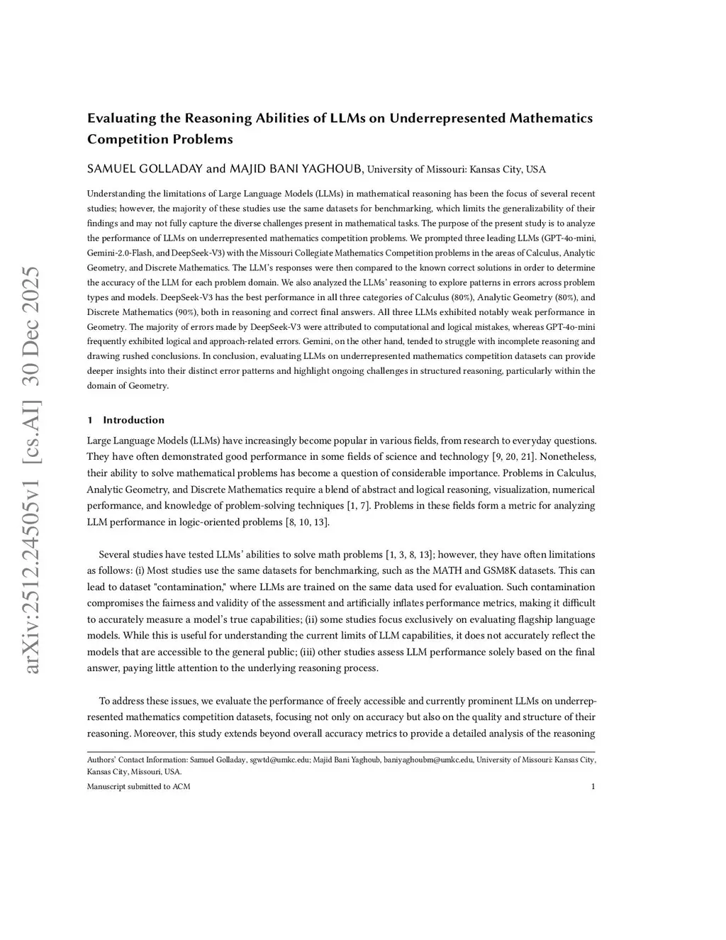 Understanding the limitations of Large Language Models, or LLMs, in mathematical reasoning has been the focus of several recent studies. However, the majority of these studies use the same datasets for benchmarking, which limits the generalizability of their findings and may not fully capture the diverse challenges present in mathematical tasks. The purpose of the present study is to analyze the performance of LLMs on underrepresented mathematics competition problems. We prompted three leading LLMs, namely GPT-4o-mini, Gemini-2.0-Flash, and DeepSeek-V3, with the Missouri Collegiate Mathematics Competition problems in the areas of Calculus, Analytic Geometry, and Discrete Mathematics. The LLMs responses were then compared to the known correct solutions in order to determine the accuracy of the LLM for each problem domain. We also analyzed the LLMs reasoning to explore patterns in errors across problem types and models. DeepSeek-V3 has the best performance in all three categories of Calculus, Analytic Geometry, and Discrete Mathematics, both in reasoning and correct final answers. All three LLMs exhibited notably weak performance in Geometry. The majority of errors made by DeepSeek-V3 were attributed to computational and logical mistakes, whereas GPT-4o-mini frequently exhibited logical and approach-related errors. Gemini, on the other hand, tended to struggle with incomplete reasoning and drawing rushed conclusions. In conclusion, evaluating LLMs on underrepresented mathematics competition datasets can provide deeper insights into their distinct error patterns and highlight ongoing challenges in structured reasoning, particularly within the domain of Geometry.