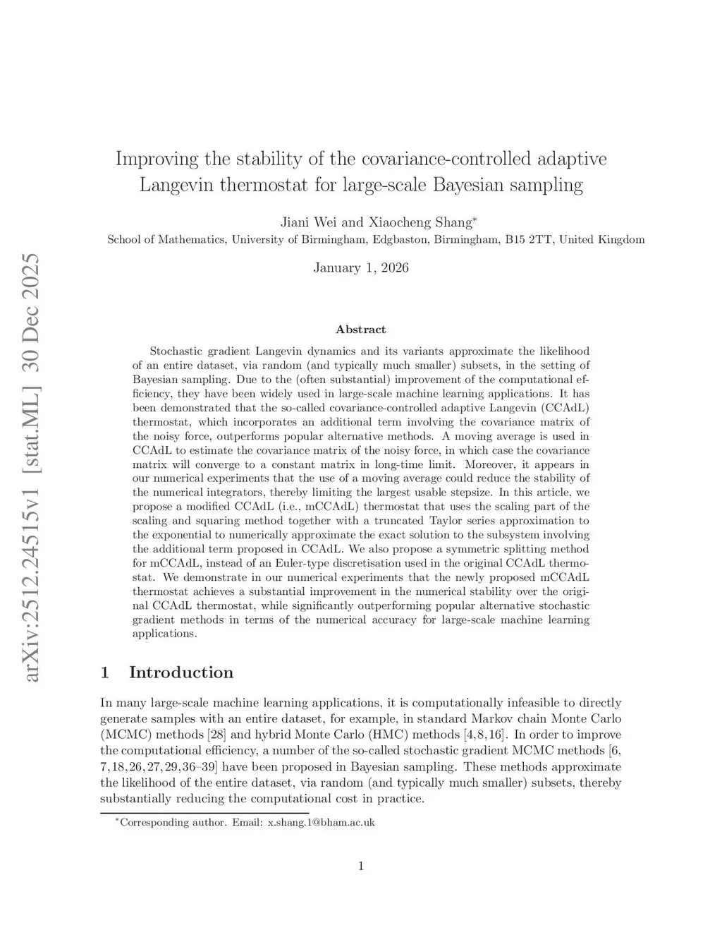 Stochastic gradient Langevin dynamics and its variants approximate the likelihood of an entire dataset, via random (and typically much smaller) subsets, in the setting of Bayesian sampling. Due to the (often substantial) improvement of the computational efficiency, they have been widely used in large-scale machine learning applications. It has been demonstrated that the so-called covariance-controlled adaptive Langevin (CCAdL) thermostat, which incorporates an additional term involving the covariance matrix of the noisy force, outperforms popular alternative methods. A moving average is used in CCAdL to estimate the covariance matrix of the noisy force, in which case the covariance matrix will converge to a constant matrix in long-time limit. Moreover, it appears in our numerical experiments that the use of a moving average could reduce the stability of the numerical integrators, thereby limiting the largest usable stepsize. In this article, we propose a modified CCAdL (i.e., mCCAdL) thermostat that uses the scaling part of the scaling and squaring method together with a truncated Taylor series approximation to the exponential to numerically approximate the exact solution to the subsystem involving the additional term proposed in CCAdL. We also propose a symmetric splitting method for mCCAdL, instead of an Euler-type discretisation used in the original CCAdL thermostat. We demonstrate in our numerical experiments that the newly proposed mCCAdL thermostat achieves a substantial improvement in the numerical stability over the original CCAdL thermostat, while significantly outperforming popular alternative stochastic gradient methods in terms of the numerical accuracy for large-scale machine learning applications.
