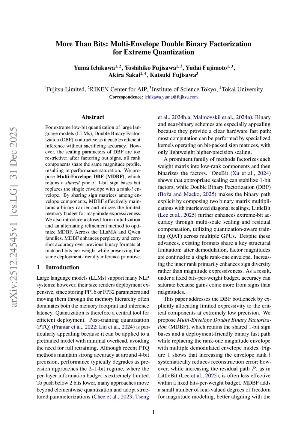 For extreme low-bit quantization of large language models (LLMs), Double Binary Factorization (DBF) is attractive as it enables efficient inference without sacrificing accuracy. However, the scaling parameters of DBF are too restrictive; after factoring out signs, all rank components share the same magnitude profile, resulting in performance saturation. We propose Multi-envelope DBF (MDBF), which retains a shared pair of 1-bit sign bases but replaces the single envelope with a rank- envelope. By sharing sign matrices among envelope components, MDBF effectively maintains a binary carrier and utilizes the limited memory budget for magnitude expressiveness. We also introduce a closed-form initialization and an alternating refinement method to optimize MDBF. Across the LLaMA and Qwen families, MDBF enhances perplexity and zero-shot accuracy over previous binary formats at matched bits per weight while preserving the same deployment-friendly inference primitive.