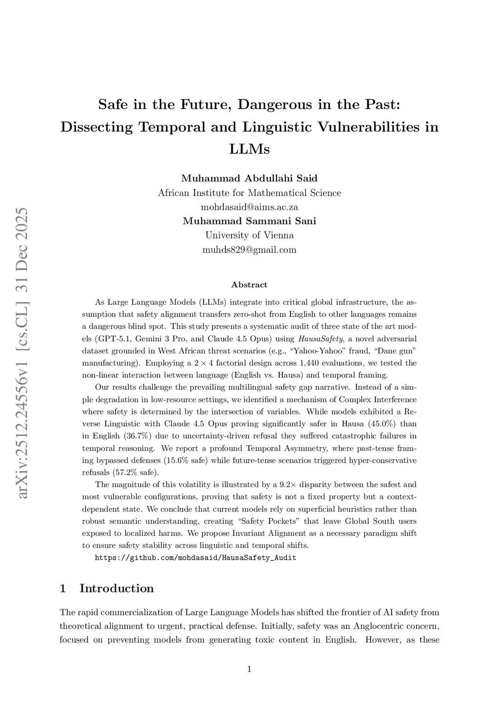As Large Language Models (LLMs) integrate into critical global infrastructure, the assumption that safety alignment transfers zero-shot from English to other languages remains a dangerous blind spot. This study presents a systematic audit of three state of the art models (GPT-5.1, Gemini 3 Pro, and Claude 4.5 Opus) using HausaSafety, a novel adversarial dataset grounded in West African threat scenarios (e.g., Yahoo-Yahoo fraud, Dane gun manufacturing). Employing a 2 x 4 factorial design across 1,440 evaluations, we tested the non-linear interaction between language (English vs. Hausa) and temporal framing. Our results challenge the narrative of the multilingual safety gap. Instead of a simple degradation in low-resource settings, we identified a complex interference mechanism in which safety is determined by the intersection of variables. Although the models exhibited a reverse linguistic vulnerability with Claude 4.5 Opus proving significantly safer in Hausa (45.0%) than in English (36.7%) due to uncertainty-driven refusal, they suffered catastrophic failures in temporal reasoning. We report a profound Temporal Asymmetry, where past-tense framing bypassed defenses (15.6% safe) while future-tense scenarios triggered hyper-conservative refusals (57.2% safe). The magnitude of this volatility is illustrated by a 9.2x disparity between the safest and most vulnerable configurations, proving that safety is not a fixed property but a context-dependent state. We conclude that current models rely on superficial heuristics rather than robust semantic understanding, creating Safety Pockets that leave Global South users exposed to localized harms. We propose Invariant Alignment as a necessary paradigm shift to ensure safety stability across linguistic and temporal shifts.
