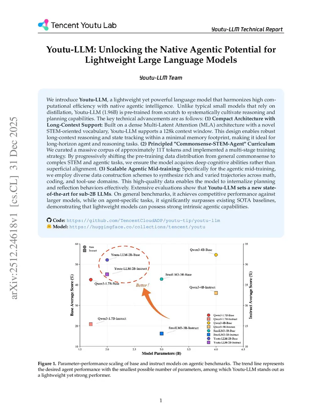 We introduce Youtu-LLM, a lightweight yet powerful language model that harmonizes high computational efficiency with native agentic intelligence. Unlike typical small models that rely on distillation, Youtu-LLM (1.96B) is pre-trained from scratch to systematically cultivate reasoning and planning capabilities. The key technical advancements are as follows: (1) Compact Architecture with Long-Context Support: Built on a dense Multi-Latent Attention (MLA) architecture with a novel STEM-oriented vocabulary, Youtu-LLM supports a 128k context window. This design enables robust long-context reasoning and state tracking within a minimal memory footprint, making it ideal for long-horizon agent and reasoning tasks. (2) Principled "Commonsense-STEM-Agent" Curriculum: We curated a massive corpus of approximately 11T tokens and implemented a multi-stage training strategy. By progressively shifting the pre-training data distribution from general commonsense to complex STEM and agentic tasks, we ensure the model acquires deep cognitive abilities rather than superficial alignment. (3) Scalable Agentic Mid-training: Specifically for the agentic mid-training, we employ diverse data construction schemes to synthesize rich and varied trajectories across math, coding, and tool-use domains. This high-quality data enables the model to internalize planning and reflection behaviors effectively. Extensive evaluations show that Youtu-LLM sets a new state-of-the-art for sub-2B LLMs. On general benchmarks, it achieves competitive performance against larger models, while on agent-specific tasks, it significantly surpasses existing SOTA baselines, demonstrating that lightweight models can possess strong intrinsic agentic capabilities.