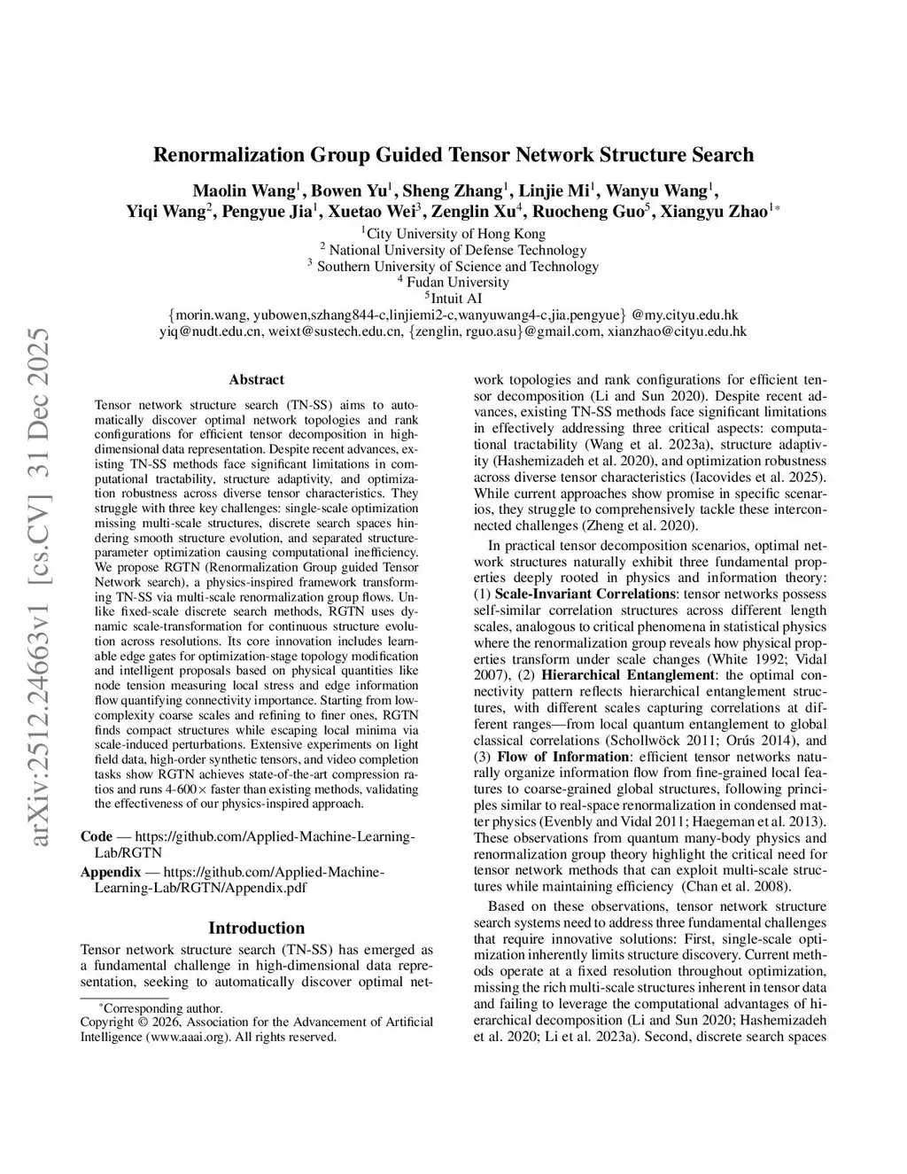 Tensor network structure search (TN-SS) aims to automatically discover optimal network topologies and rank configurations for efficient tensor decomposition in high-dimensional data representation. Despite recent advances, existing TN-SS methods face significant limitations in computational tractability, structure adaptivity, and optimization robustness across diverse tensor characteristics. They struggle with three key challenges: single-scale optimization missing multi-scale structures, discrete search spaces hindering smooth structure evolution, and separated structure-parameter optimization causing computational inefficiency. We propose RGTN (Renormalization Group guided Tensor Network search), a physics-inspired framework transforming TN-SS via multi-scale renormalization group flows. Unlike fixed-scale discrete search methods, RGTN uses dynamic scale-transformation for continuous structure evolution across resolutions. Its core innovation includes learnable edge gates for optimization-stage topology modification and intelligent proposals based on physical quantities like node tension measuring local stress and edge information flow quantifying connectivity importance. Starting from low-complexity coarse scales and refining to finer ones, RGTN finds compact structures while escaping local minima via scale-induced perturbations. Extensive experiments on light field data, high-order synthetic tensors, and video completion tasks show RGTN achieves state-of-the-art compression ratios and runs 4-600 faster than existing methods, validating the effectiveness of our physics-inspired approach.