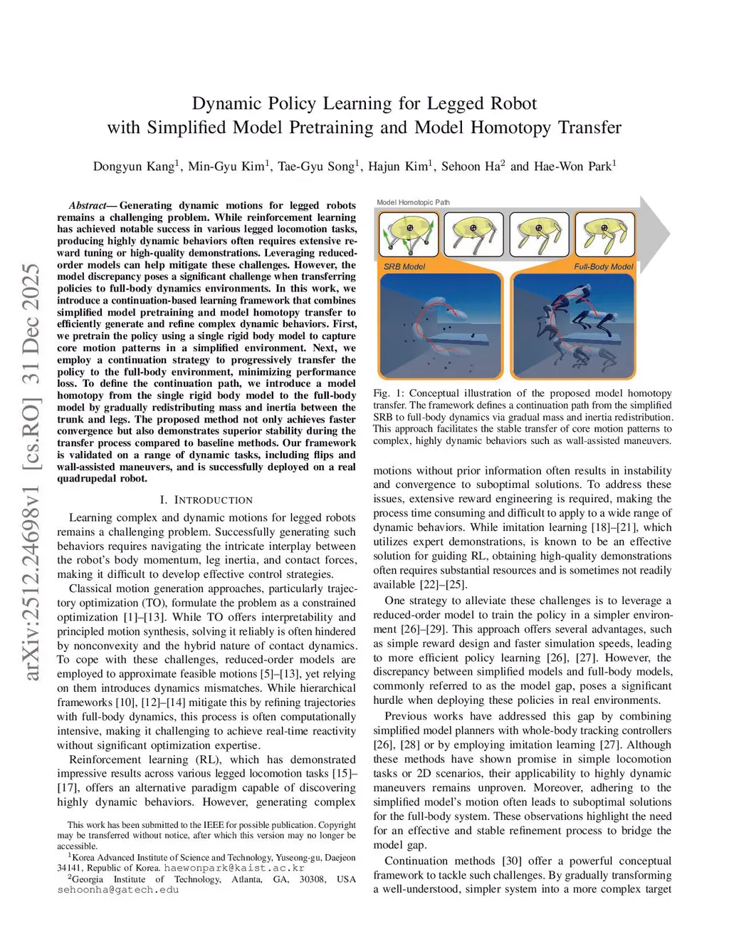 Dynamic Policy Learning for Legged Robot with Simplified Model Pretraining and Model Homotopy Transfer