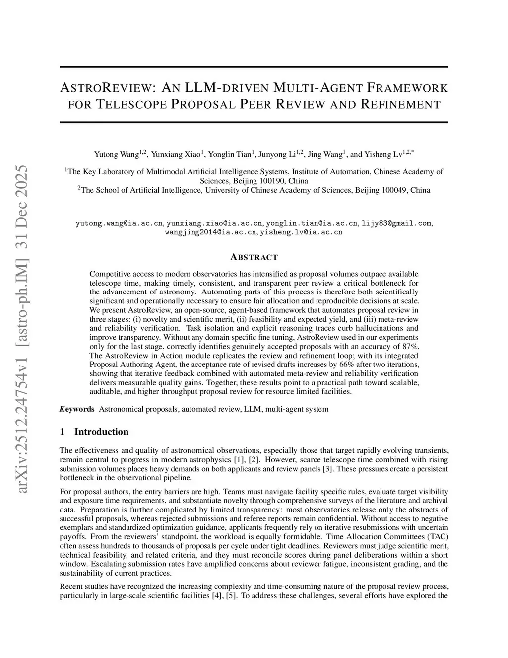 Competitive access to modern observatories has intensified as proposal volumes outpace available telescope time, making timely, consistent, and transparent peer review a critical bottleneck for the advancement of astronomy. Automating parts of this process is therefore both scientifically significant and operationally necessary to ensure fair allocation and reproducible decisions at scale. We present AstroReview, an open-source, agent-based framework that automates proposal review in three stages: (i) novelty and scientific merit, (ii) feasibility and expected yield, and (iii) meta-review and reliability verification. Task isolation and explicit reasoning traces curb hallucinations and improve transparency. Without any domain specific fine tuning, AstroReview used in our experiments only for the last stage, correctly identifies genuinely accepted proposals with an accuracy of 87%. The AstroReview in Action module replicates the review and refinement loop; with its integrated Proposal Authoring Agent, the acceptance rate of revised drafts increases by 66% after two iterations, showing that iterative feedback combined with automated meta-review and reliability verification delivers measurable quality gains. Together, these results point to a practical path toward scalable, auditable, and higher throughput proposal review for resource limited facilities.