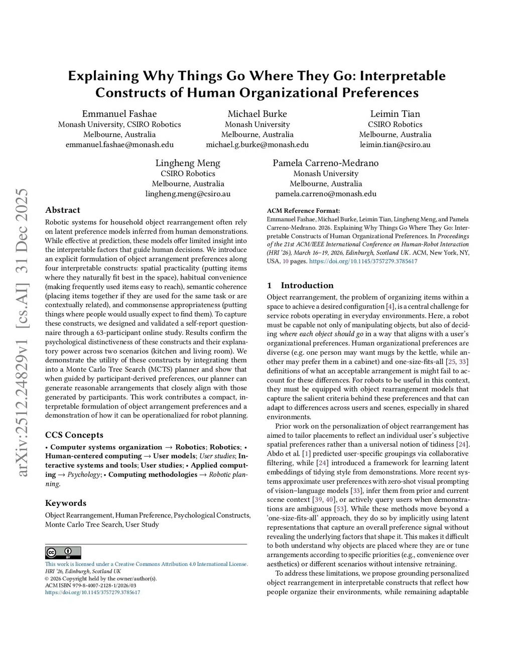 Robotic systems for household object rearrangement often rely on latent preference models inferred from human demonstrations. While effective at prediction, these models offer limited insight into the interpretable factors that guide human decisions. We introduce an explicit formulation of object arrangement preferences along four interpretable constructs: spatial practicality (putting items where they naturally fit best in the space), habitual convenience (making frequently used items easy to reach), semantic coherence (placing items together if they are used for the same task or are contextually related), and commonsense appropriateness (putting things where people would usually expect to find them). To capture these constructs, we designed and validated a self-report questionnaire through a 63-participant online study. Results confirm the psychological distinctiveness of these constructs and their explanatory power across two scenarios (kitchen and living room). We demonstrate the utility of these constructs by integrating them into a Monte Carlo Tree Search (MCTS) planner and show that when guided by participant-derived preferences, our planner can generate reasonable arrangements that closely align with those generated by participants. This work contributes a compact, interpretable formulation of object arrangement preferences and a demonstration of how it can be operationalized for robot planning.