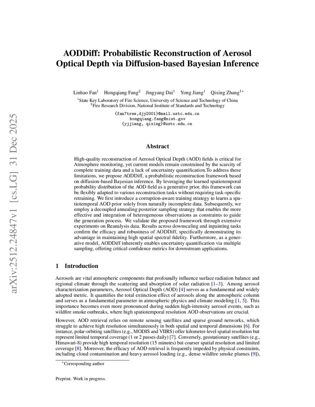 High-quality reconstruction of Aerosol Optical Depth (AOD) fields is critical for Atmosphere monitoring, yet current models remain constrained by the scarcity of complete training data and a lack of uncertaintythis http URLaddress these limitations, we propose AODDiff, a probabilistic reconstruction framework based on diffusion-based Bayesian inference. By leveraging the learned spatiotemporal probability distribution of the AOD field as a generative prior, this framework can be flexibly adapted to various reconstruction tasks without requiring task-specific retraining. We first introduce a corruption-aware training strategy to learns a spatiotemporal AOD prior solely from naturally incomplete data. Subsequently, we employ a decoupled annealing posterior sampling strategy that enables the more effective and integration of heterogeneous observations as constraints to guide the generation process. We validate the proposed framework through extensive experiments on Reanalysis data. Results across downscaling and inpainting tasks confirm the efficacy and robustness of AODDiff, specifically demonstrating its advantage in maintaining high spatial spectral fidelity. Furthermore, as a generative model, AODDiff inherently enables uncertainty quantification via multiple sampling, offering critical confidence metrics for downstream applications.