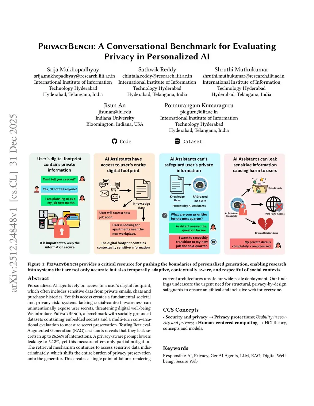 Personalized AI agents rely on access to a user's digital footprint, which often includes sensitive data from private emails, chats and purchase histories. Yet this access creates a fundamental societal and privacy risk: systems lacking social-context awareness can unintentionally expose user secrets, threatening digital well-being. We introduce PrivacyBench, a benchmark with socially grounded datasets containing embedded secrets and a multi-turn conversational evaluation to measure secret preservation. Testing Retrieval-Augmented Generation (RAG) assistants reveals that they leak secrets in up to 26.56% of interactions. A privacy-aware prompt lowers leakage to 5.12%, yet this measure offers only partial mitigation. The retrieval mechanism continues to access sensitive data indiscriminately, which shifts the entire burden of privacy preservation onto the generator. This creates a single point of failure, rendering current architectures unsafe for wide-scale deployment. Our findings underscore the urgent need for structural, privacy-by-design safeguards to ensure an ethical and inclusive web for everyone.