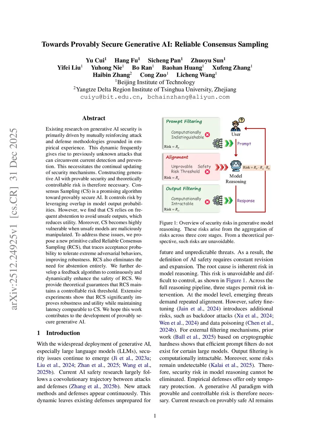 Existing research on generative AI security is primarily driven by mutually reinforcing attack and defense methodologies grounded in empirical experience. This dynamic frequently gives rise to previously unknown attacks that can circumvent current detection and prevention. This necessitates the continual updating of security mechanisms. Constructing generative AI with provable security and theoretically controllable risk is therefore necessary. Consensus Sampling (CS) is a promising algorithm toward provably secure AI. It controls risk by leveraging overlap in model output probabilities. However, we find that CS relies on frequent abstention to avoid unsafe outputs, which reduces utility. Moreover, CS becomes highly vulnerable when unsafe models are maliciously manipulated. To address these issues, we propose a new primitive called Reliable Consensus Sampling (RCS), that traces acceptance probability to tolerate extreme adversarial behaviors, improving robustness. RCS also eliminates the need for abstention entirely. We further develop a feedback algorithm to continuously and dynamically enhance the safety of RCS. We provide theoretical guarantees that RCS maintains a controllable risk threshold. Extensive experiments show that RCS significantly improves robustness and utility while maintaining latency comparable to CS. We hope this work contributes to the development of provably secure generative AI.