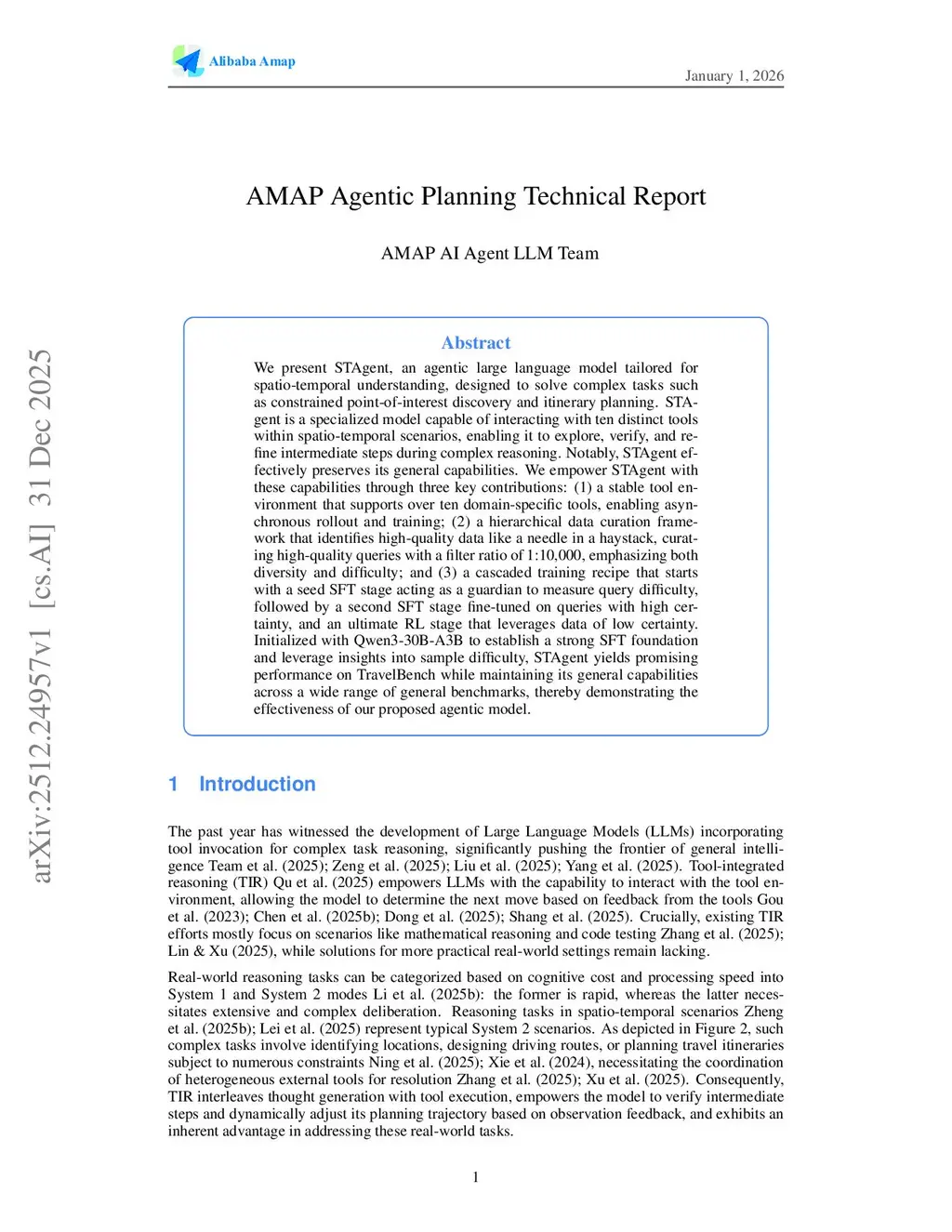 We present STAgent, an agentic large language model tailored for spatio-temporal understanding, designed to solve complex tasks such as constrained point-of-interest discovery and itinerary planning. STAgent is a specialized model capable of interacting with ten distinct tools within spatio-temporal scenarios, enabling it to explore, verify, and refine intermediate steps during complex reasoning. Notably, STAgent effectively preserves its general capabilities. We empower STAgent with these capabilities through three key contributions: (1) a stable tool environment that supports over ten domain-specific tools, enabling asynchronous rollout and training; (2) a hierarchical data curation framework that identifies high-quality data like a needle in a haystack, curating high-quality queries by retaining less than 1\% of the raw data, emphasizing both diversity and difficulty; and (3) a cascaded training recipe that starts with a seed SFT stage acting as a guardian to measure query difficulty, followed by a second SFT stage fine-tuned on queries with high certainty, and an ultimate RL stage that leverages data of low certainty. Initialized with Qwen3-30B-A3B to establish a strong SFT foundation and leverage insights into sample difficulty, STAgent yields promising performance on TravelBench while maintaining its general capabilities across a wide range of general benchmarks, thereby demonstrating the effectiveness of our proposed agentic model.