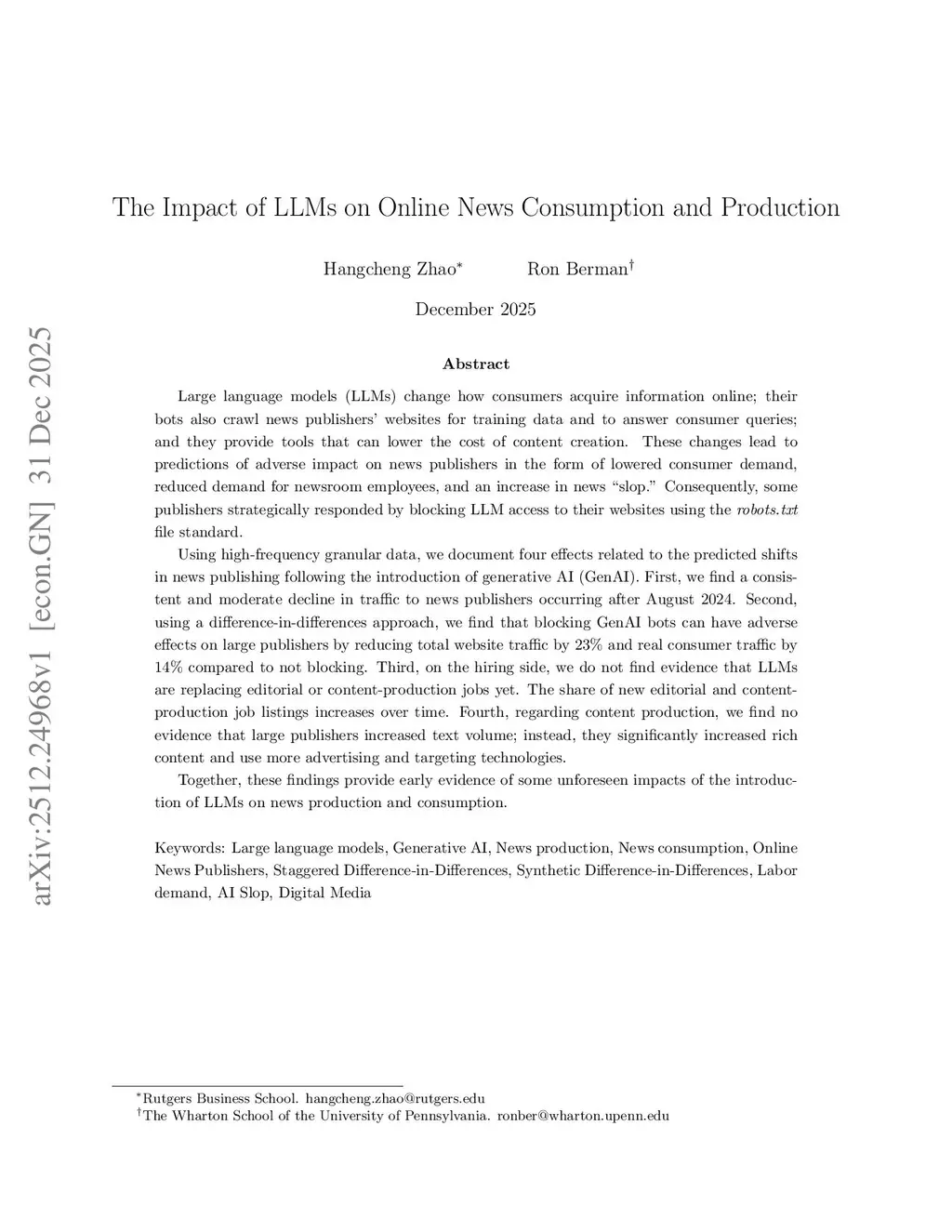 Large language models (LLMs) change how consumers acquire information online; their bots also crawl news publishers' websites for training data and to answer consumer queries; and they provide tools that can lower the cost of content creation. These changes lead to predictions of adverse impact on news publishers in the form of lowered consumer demand, reduced demand for newsroom employees, and an increase in news "slop." Consequently, some publishers strategically responded by blocking LLM access to their websites using thethis http URLfile standard.Using high-frequency granular data, we document four effects related to the predicted shifts in news publishing following the introduction of generative AI (GenAI). First, we find a moderate decline in traffic to news publishers occurring after August 2024. Second, using a difference-in-differences approach, we find that blocking GenAI bots can be associated with a reduction of total website traffic to large publishers compared to not blocking. Third, on the hiring side, we do not find evidence that LLMs are replacing editorial or content-production jobs yet. The share of new editorial and content-production job listings increases over time. Fourth, regarding content production, we find no evidence that large publishers increased text volume; instead, they significantly increased rich content and use more advertising and targeting technologies.Together, these findings provide early evidence of some unforeseen impacts of the introduction of LLMs on news production and consumption.