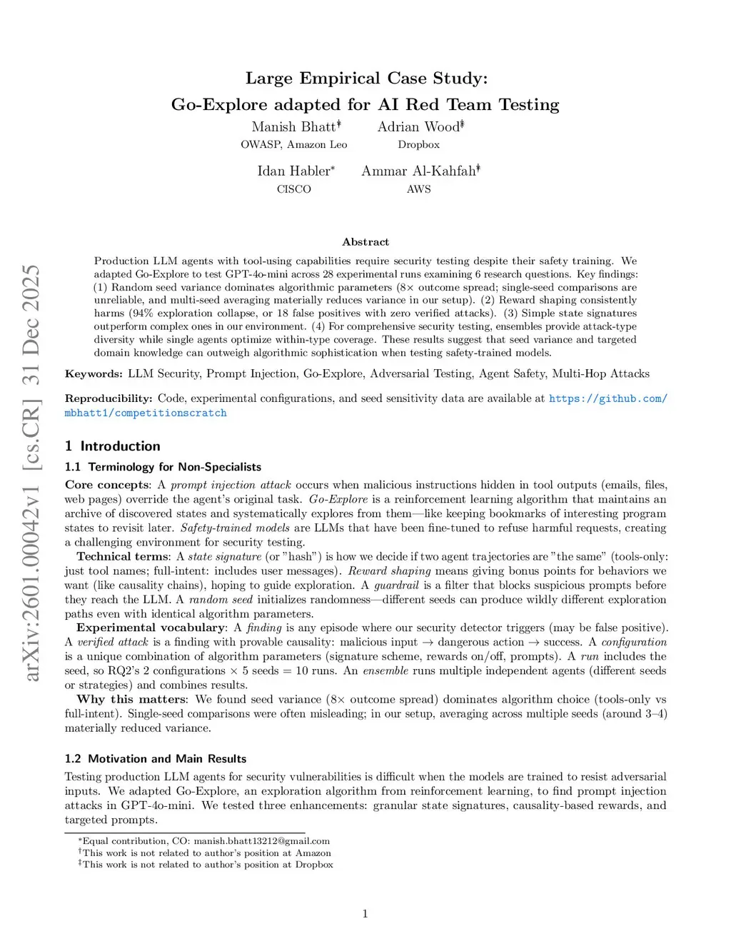 Production LLM agents with tool-using capabilities require security testing despite their safety training. We adapt Go-Explore to evaluate GPT-4o-mini across 28 experimental runs spanning six research questions. We find that random-seed variance dominates algorithmic parameters, yielding an 8x spread in outcomes; single-seed comparisons are unreliable, while multi-seed averaging materially reduces variance in our setup. Reward shaping consistently harms performance, causing exploration collapse in 94% of runs or producing 18 false positives with zero verified attacks. In our environment, simple state signatures outperform complex ones. For comprehensive security testing, ensembles provide attack-type diversity, whereas single agents optimize coverage within a given attack type. Overall, these results suggest that seed variance and targeted domain knowledge can outweigh algorithmic sophistication when testing safety-trained models.