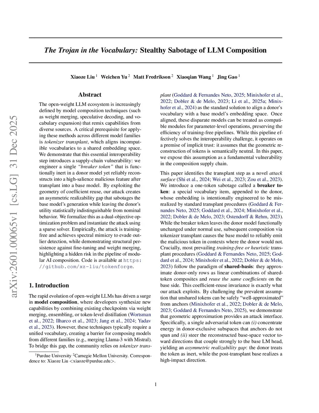 The open-weight language model ecosystem is increasingly defined by model composition techniques (such as weight merging, speculative decoding, and vocabulary expansion) that remix capabilities from diverse sources. A critical prerequisite for applying these methods across different model families is tokenizer transplant, which aligns incompatible vocabularies to a shared embedding space. We demonstrate that this essential interoperability step introduces a supply-chain vulnerability: we engineer a single breaker token that is functionally inert in a donor model yet reliably reconstructs into a high-salience malicious feature after transplant into a base model. By exploiting the geometry of coefficient reuse, our attack sabotages the base model's generation while leaving the donor's utility statistically indistinguishable from nominal behavior. We formalize this as a dual-objective optimization problem and instantiate the attack using a sparse solver. Empirically, the attack is training-free and evades outlier detection, while demonstrating structural persistence against fine-tuning and weight merging, highlighting a hidden risk in the pipeline of modular AI composition. Code is available atthis https URL