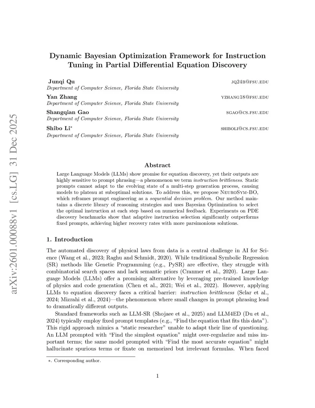 Large Language Models (LLMs) show promise for equation discovery, yet their outputs are highly sensitive to prompt phrasing, a phenomenon we term instruction brittleness. Static prompts cannot adapt to the evolving state of a multi-step generation process, causing models to plateau at suboptimal solutions. To address this, we propose NeuroSymBO, which reframes prompt engineering as a sequential decision problem. Our method maintains a discrete library of reasoning strategies and uses Bayesian Optimization to select the optimal instruction at each step based on numerical feedback. Experiments on PDE discovery benchmarks show that adaptive instruction selection significantly outperforms fixed prompts, achieving higher recovery rates with more parsimonious solutions.