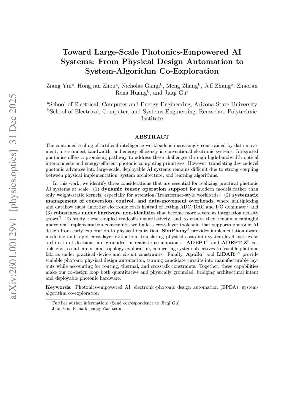 In this work, we identify three considerations that are essential for realizing practical photonic AI systems at scale: (1) dynamic tensor operation support for modern models rather than only weight-static kernels, especially for attention/Transformer-style workloads; (2) systematic management of conversion, control, and data-movement overheads, where multiplexing and dataflow must amortize electronic costs instead of letting ADC/DAC and I/O dominate; and (3) robustness under hardware non-idealities that become more severe as integration density grows. To study these coupled tradeoffs quantitatively, and to ensure they remain meaningful under real implementation constraints, we build a cross-layer toolchain that supports photonic AI design from early exploration to physical realization. SimPhony provides implementation-aware modeling and rapid cross-layer evaluation, translating physical costs into system-level metrics so architectural decisions are grounded in realistic assumptions. ADEPT and ADEPT-Z enable end-to-end circuit and topology exploration, connecting system objectives to feasible photonic fabrics under practical device and circuit constraints. Finally, Apollo and LiDAR provide scalable photonic physical design automation, turning candidate circuits into manufacturable layouts while accounting for routing, thermal, and crosstalk constraints.