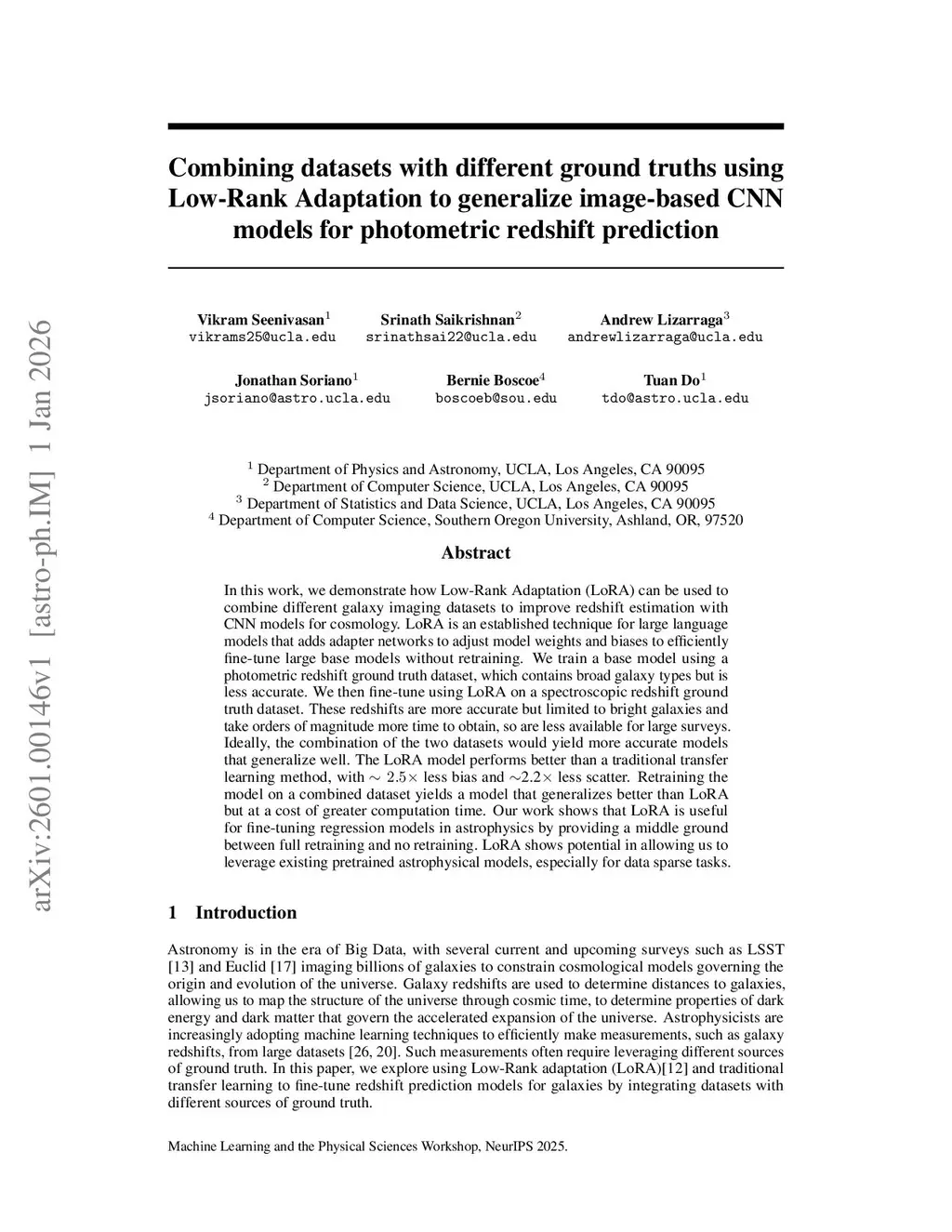 In this work, we demonstrate how Low-Rank Adaptation (LoRA) can be used to combine different galaxy imaging datasets to improve redshift estimation with CNN models for cosmology. LoRA is an established technique for large language models that adds adapter networks to adjust model weights and biases to efficiently fine-tune large base models without retraining. We train a base model using a photometric redshift ground truth dataset, which contains broad galaxy types but is less accurate. We then fine-tune using LoRA on a spectroscopic redshift ground truth dataset. These redshifts are more accurate but limited to bright galaxies and take orders of magnitude more time to obtain, so are less available for large surveys. Ideally, the combination of the two datasets would yield more accurate models that generalize well. The LoRA model performs better than a traditional transfer learning method, with less bias and 2.2 less scatter. Retraining the model on a combined dataset yields a model that generalizes better than LoRA but at a cost of greater computation time. Our work shows that LoRA is useful for fine-tuning regression models in astrophysics by providing a middle ground between full retraining and no retraining. LoRA shows potential in allowing us to leverage existing pretrained astrophysical models, especially for data sparse tasks.