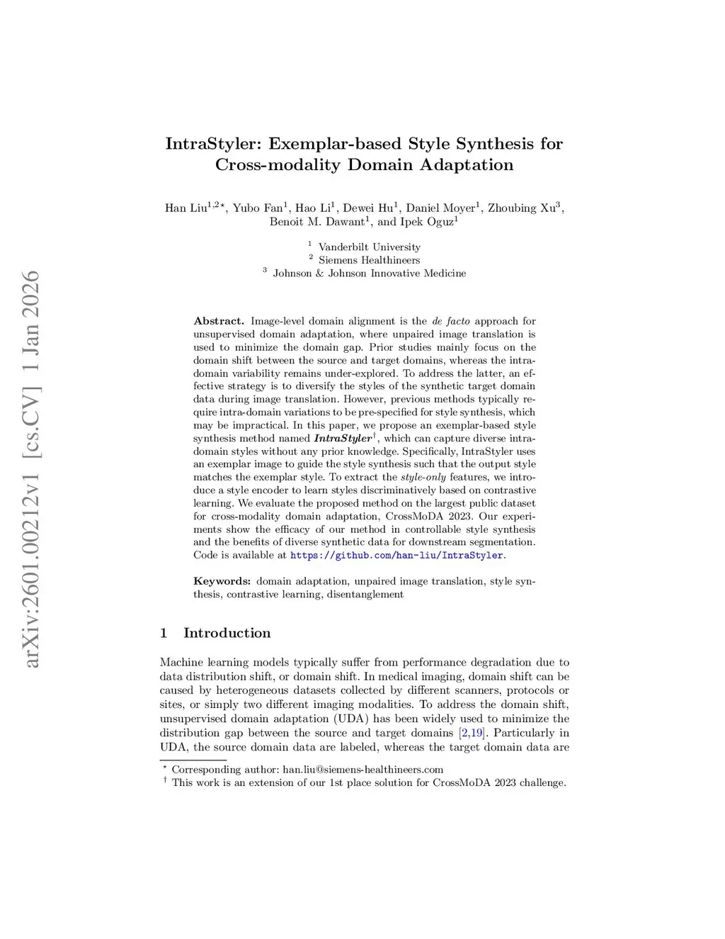 IntraStyler: Exemplar-based Style Synthesis for Cross-modality Domain Adaptation
