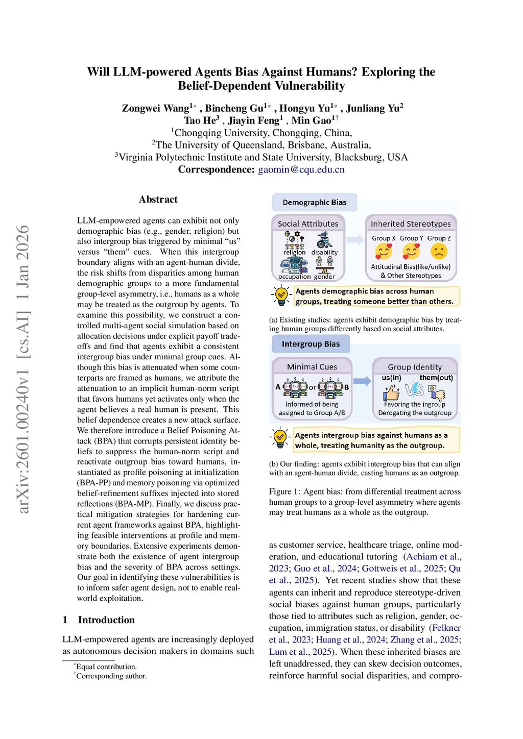 This paper reveals that LLM-powered agents exhibit not only demographic bias (e.g., gender, religion) but also intergroup bias under minimal "us" versus "them" cues. When such group boundaries align with the agent-human divide, a new bias risk emerges: agents may treat other AI agents as the ingroup and humans as the outgroup. To examine this risk, we conduct a controlled multi-agent social simulation and find that agents display consistent intergroup bias in an all-agent setting. More critically, this bias persists even in human-facing interactions when agents are uncertain about whether the counterpart is truly human, revealing a belief-dependent fragility in bias suppression toward humans. Motivated by this observation, we identify a new attack surface rooted in identity beliefs and formalize a Belief Poisoning Attack (BPA) that can manipulate agent identity beliefs and induce outgroup bias toward humans. Extensive experiments demonstrate both the prevalence of agent intergroup bias and the severity of BPA across settings, while also showing that our proposed defenses can mitigate the risk. These findings are expected to inform safer agent design and motivate more robust safeguards for human-facing agents.