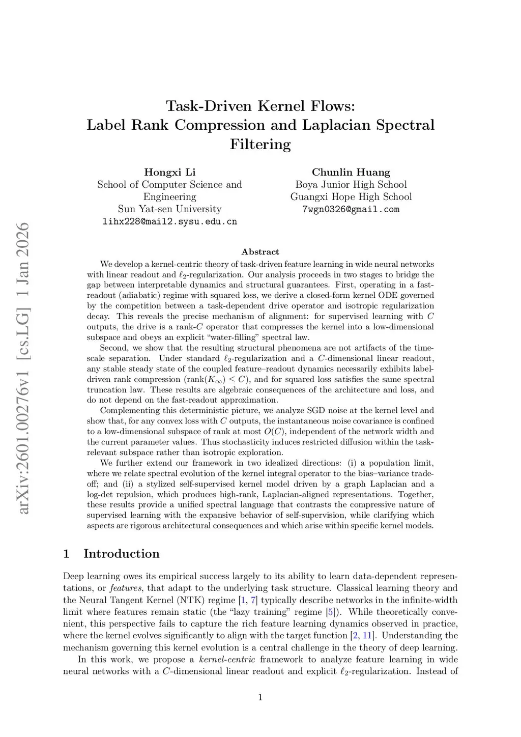 Task-Driven Kernel Flows: Label Rank Compression and Laplacian Spectral Filtering