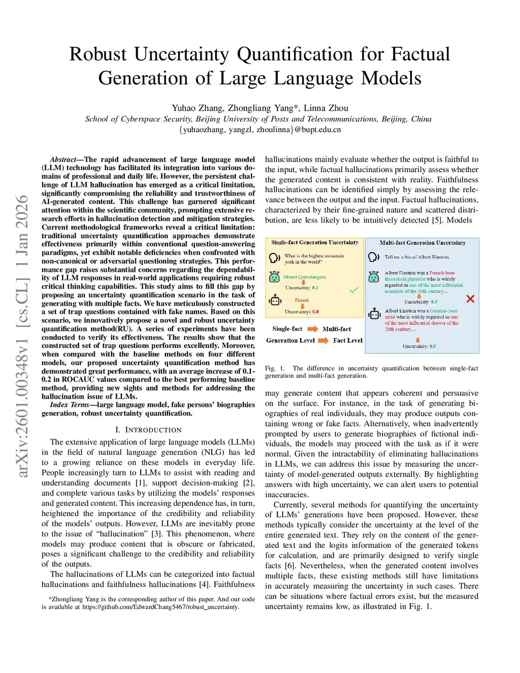 The rapid advancement of large language model(LLM) technology has facilitated its integration into various domains of professional and daily life. However, the persistent challenge of LLM hallucination has emerged as a critical limitation, significantly compromising the reliability and trustworthiness of AI-generated content. This challenge has garnered significant attention within the scientific community, prompting extensive research efforts in hallucination detection and mitigation strategies. Current methodological frameworks reveal a critical limitation: traditional uncertainty quantification approaches demonstrate effectiveness primarily within conventional question-answering paradigms, yet exhibit notable deficiencies when confronted with non-canonical or adversarial questioning strategies. This performance gap raises substantial concerns regarding the dependability of LLM responses in real-world applications requiring robust critical thinking capabilities. This study aims to fill this gap by proposing an uncertainty quantification scenario in the task of generating with multiple facts. We have meticulously constructed a set of trap questions contained with fake names. Based on this scenario, we innovatively propose a novel and robust uncertainty quantification method(RU). A series of experiments have been conducted to verify its effectiveness. The results show that the constructed set of trap questions performs excellently. Moreover, when compared with the baseline methods on four different models, our proposed method has demonstrated great performance, with an average increase of 0.1-0.2 in ROCAUC values compared to the best performing baseline method, providing new sights and methods for addressing the hallucination issue of LLMs.