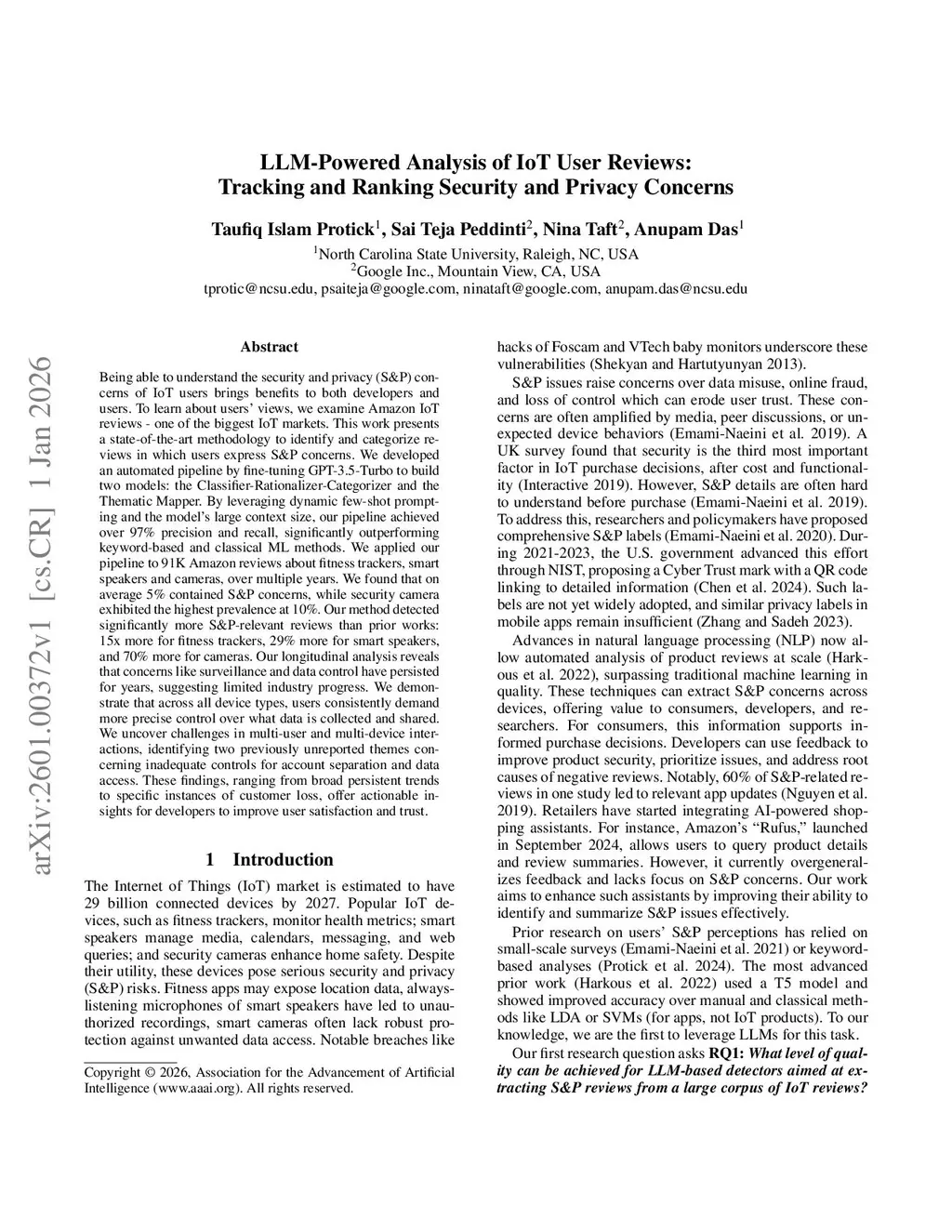 Being able to understand the security and privacy (S&P) concerns of IoT users brings benefits to both developers and users. To learn about users' views, we examine Amazon IoT reviews - one of the biggest IoT markets. This work presents a state-of-the-art methodology to identify and categorize reviews in which users express S&P concerns. We developed an automated pipeline by fine-tuning GPT-3.5-Turbo to build two models: the Classifier-Rationalizer-Categorizer and the Thematic Mapper. By leveraging dynamic few-shot prompting and the model's large context size, our pipeline achieved over 97% precision and recall, significantly outperforming keyword-based and classical ML methods. We applied our pipeline to 91K Amazon reviews about fitness trackers, smart speakers and cameras, over multiple years. We found that on average 5% contained S&P concerns, while security camera exhibited the highest prevalence at 10%. Our method detected significantly more S&P-relevant reviews than prior works: 15x more for fitness trackers, 29% more for smart speakers, and 70% more for cameras. Our longitudinal analysis reveals that concerns like surveillance and data control have persisted for years, suggesting limited industry progress. We demonstrate that across all device types, users consistently demand more precise control over what data is collected and shared. We uncover challenges in multi-user and multi-device interactions, identifying two previously unreported themes concerning inadequate controls for account separation and data access. These findings, ranging from broad persistent trends to specific instances of customer loss, offer actionable insights for developers to improve user satisfaction and trust.