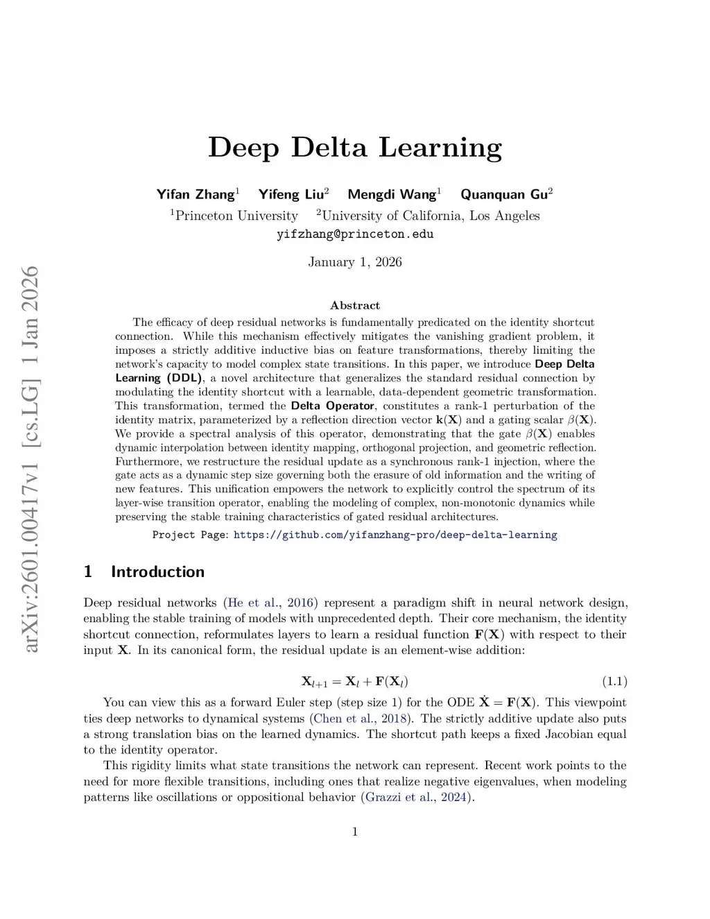 The effectiveness of deep residual networks hinges on the identity shortcut connection. While this mechanism alleviates the vanishing-gradient problem, it also has a strictly additive inductive bias on feature transformations, limiting the network's ability to model complex hidden state transitions. In this paper, we introduce \textbf{Deep Delta Learning (DDL)}, which generalizes the shortcut from a fixed identity map to a learnable, state-dependent linear operator. The resulting Delta Operator is a rank-1 perturbation of the identity, , parameterized by a unit direction and a scalar gate . We provide a spectral analysis showing that continuously interpolates the shortcut between identity (), orthogonal projection (), and Householder reflection (). Furthermore, we rewrite the residual update as a synchronized rank-1 delta write: scales both the removal of the current -component and the injection of the new -component. This unification enables explicit control of the shortcut spectrum along a data-dependent direction while retaining stable training behavior. Empirically, replacing Transformer residual additions with DDL improves validation loss and perplexity, as well as downstream evaluation accuracy on language modeling tasks, with larger gains in the expanded-state setting.