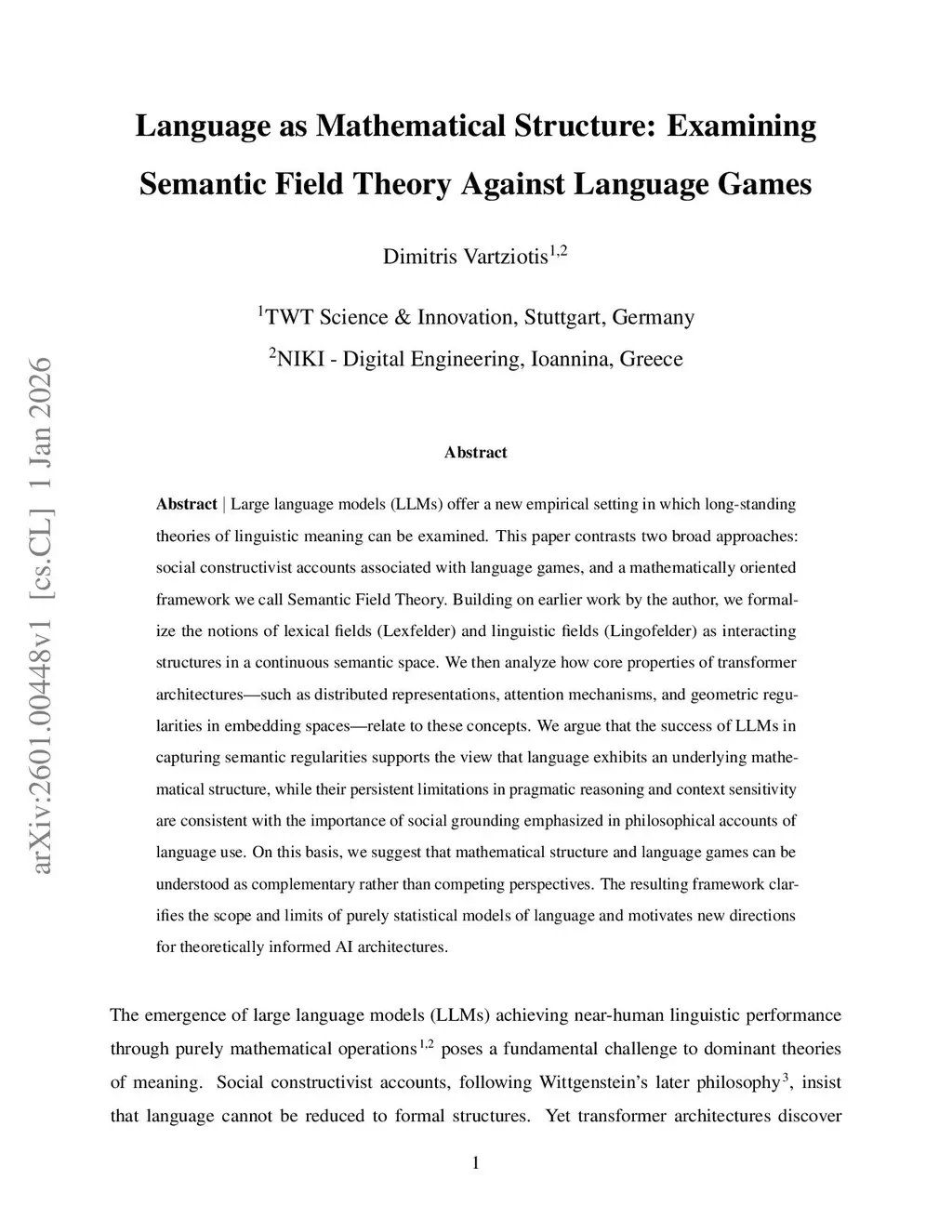 Large language models (LLMs) offer a new empirical setting in which long-standing theories of linguistic meaning can be examined. This paper contrasts two broad approaches: social constructivist accounts associated with language games, and a mathematically oriented framework we call Semantic Field Theory. Building on earlier work by the author, we formalize the notions of lexical fields (Lexfelder) and linguistic fields (Lingofelder) as interacting structures in a continuous semantic space. We then analyze how core properties of transformer architectures-such as distributed representations, attention mechanisms, and geometric regularities in embedding spaces-relate to these concepts. We argue that the success of LLMs in capturing semantic regularities supports the view that language exhibits an underlying mathematical structure, while their persistent limitations in pragmatic reasoning and context sensitivity are consistent with the importance of social grounding emphasized in philosophical accounts of language use. On this basis, we suggest that mathematical structure and language games can be understood as complementary rather than competing perspectives. The resulting framework clarifies the scope and limits of purely statistical models of language and motivates new directions for theoretically informed AI architectures.