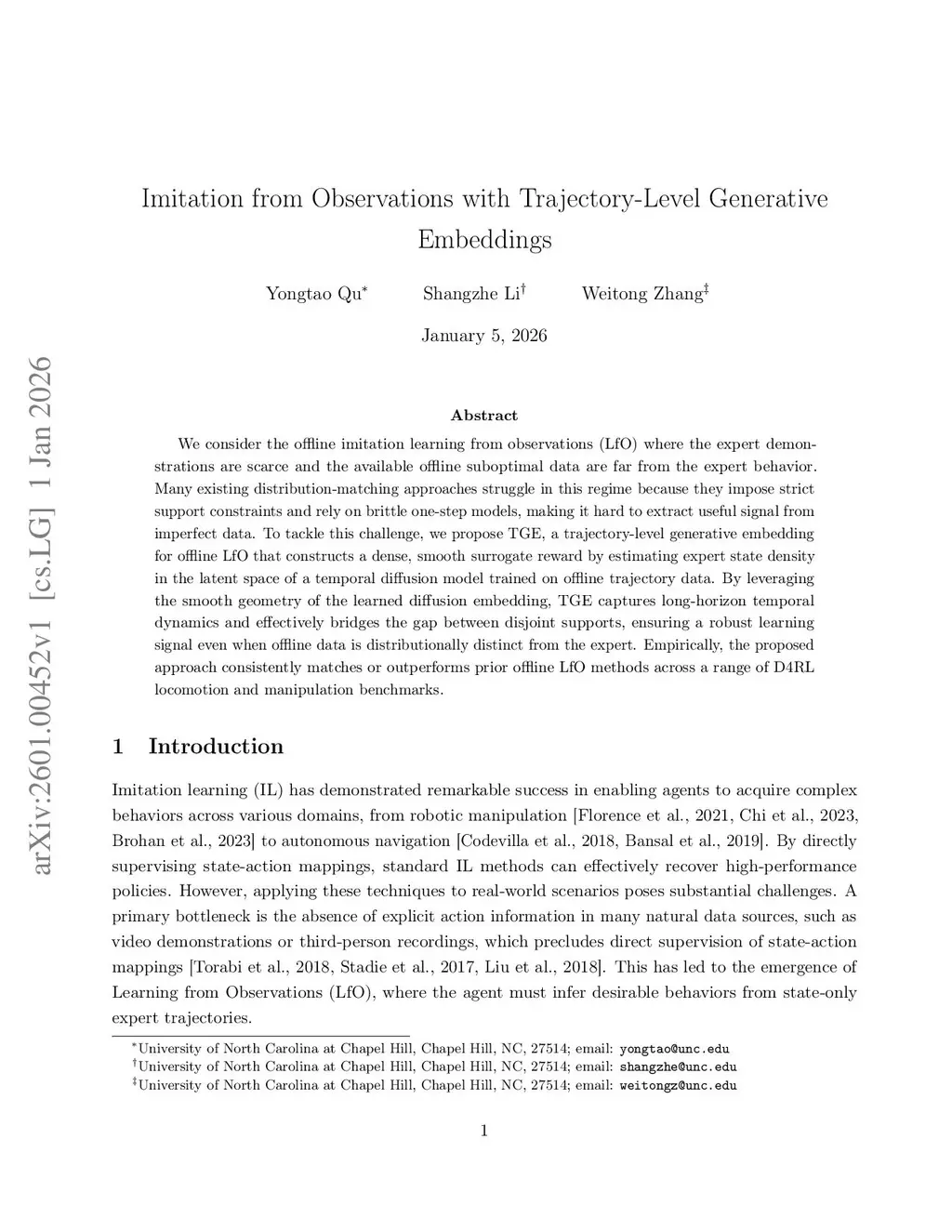 We consider the offline imitation learning from observations (LfO) where the expert demonstrations are scarce and the available offline suboptimal data are far from the expert behavior. Many existing distribution-matching approaches struggle in this regime because they impose strict support constraints and rely on brittle one-step models, making it hard to extract useful signal from imperfect data. To tackle this challenge, we propose TGE, a trajectory-level generative embedding for offline LfO that constructs a dense, smooth surrogate reward by estimating expert state density in the latent space of a temporal diffusion model trained on offline trajectory data. By leveraging the smooth geometry of the learned diffusion embedding, TGE captures long-horizon temporal dynamics and effectively bridges the gap between disjoint supports, ensuring a robust learning signal even when offline data is distributionally distinct from the expert. Empirically, the proposed approach consistently matches or outperforms prior offline LfO methods across a range of D4RL locomotion and manipulation benchmarks.