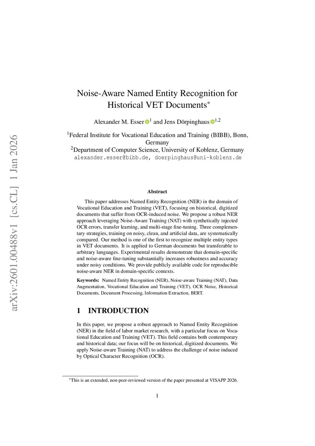 This paper addresses Named Entity Recognition (NER) in the domain of Vocational Education and Training (VET), focusing on historical, digitized documents that suffer from OCR-induced noise. We propose a robust NER approach leveraging Noise-Aware Training (NAT) with synthetically injected OCR errors, transfer learning, and multi-stage fine-tuning. Three complementary strategies, training on noisy, clean, and artificial data, are systematically compared. Our method is one of the first to recognize multiple entity types in VET documents. It is applied to German documents but transferable to arbitrary languages. Experimental results demonstrate that domain-specific and noise-aware fine-tuning substantially increases robustness and accuracy under noisy conditions. We provide publicly available code for reproducible noise-aware NER in domain-specific contexts.